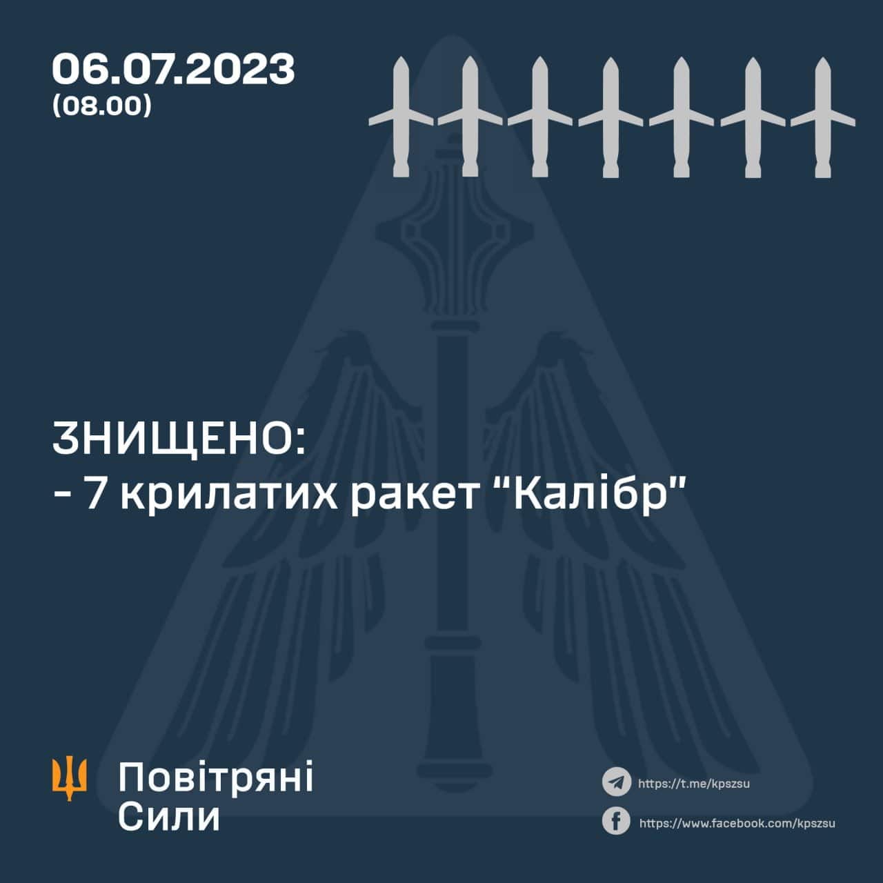 Як повідомили у Повітряних Силах ЗСУ, близько 1-ї ночі росіяни завдали удару з акваторії Чорного моря. Із надводних носіїв та підводних човнів здійснено пуски крилатих ракет «Калібр». Було зафіксовано кілька груп ракет, які спершу прямували в північному напрямку, використовуючи рельєф місцевості та русло Дніпра, а потім різко змінили курс на Захід.