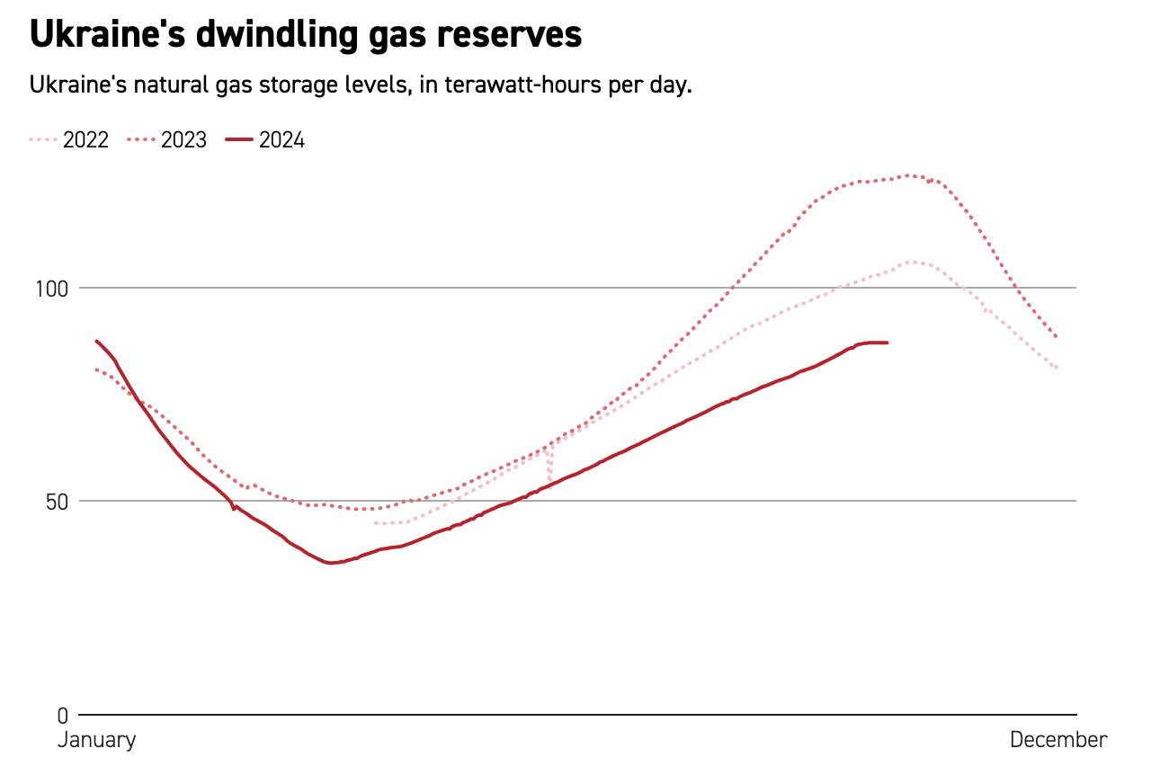 Атомна проблема є більш серйозною частково через те, що запаси іншого палива в Україні скорочуються. «Постачання газу в країні може бути недостатнім для задоволення попиту цієї зими», – сказала Аура Сабадус, експерт з енергетичних ринків Східної Європи в консалтинговій компанії ICIS, оскільки Київ «невпевнено» досягне своїх цілей щодо заповнення газосховищ.