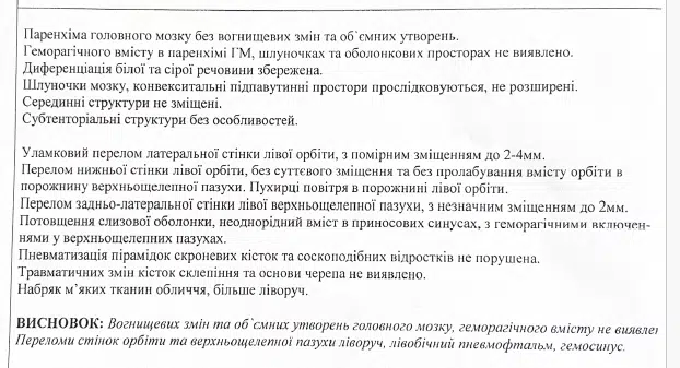 Потерпілого госпіталізували. У нього діагностували закриту черепно-мозкову травму, струс мозку та перелом виличної кістки. За результатами комп’ютерної томографії встановлено уламковий перелом латеральної стінки лівої орбіти, перелом нижньої стінки орбіти, пневмофтальм, перелом верхньощелепної пазухи зі зміщенням, гемосинус та виражений набряк м’яких тканин. Медики готують пацієнта до складного оперативного втручання із встановленням титанових пластин.