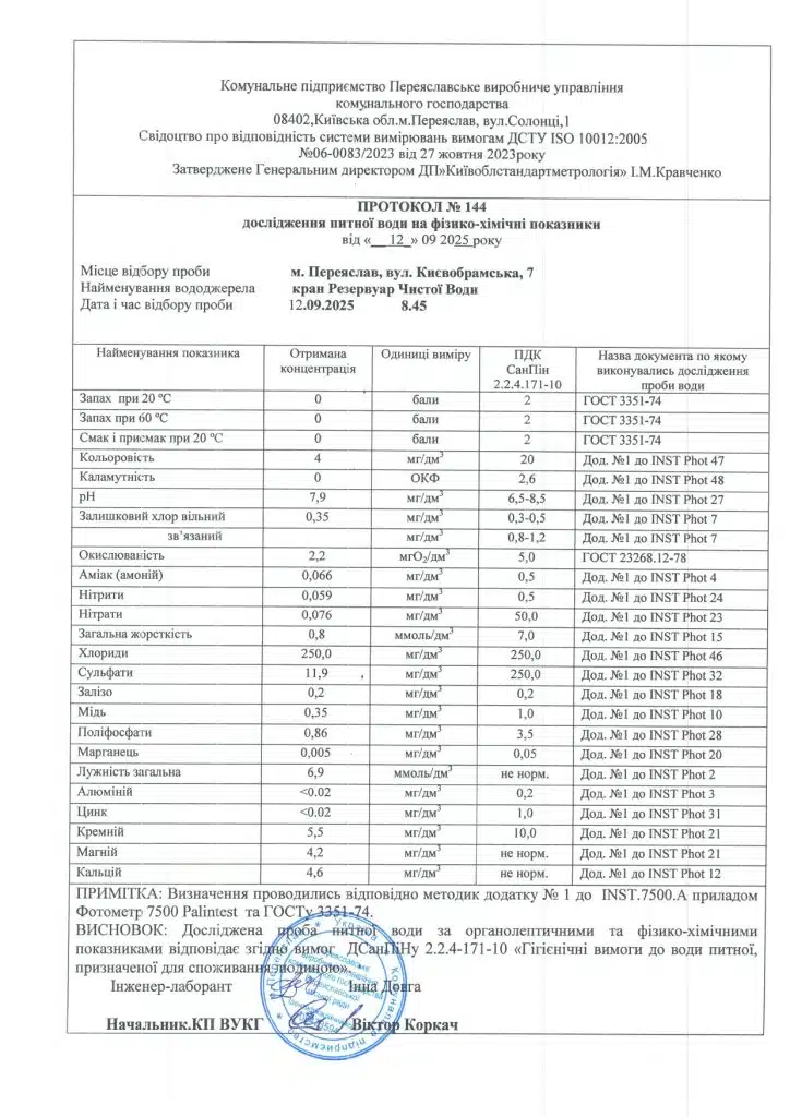 Фахівці 12 вересня відібрали пробу у резервуарі чистої води на вулиці Києвобрамській. Зразки перевірили за фізико-хімічними показниками. Дослідження виконували відповідно до методик додатку №1 до INST.7500.А із використанням приладу Фотометр 7500 Palintest, а також згідно з вимогами ГОСТ 3351-74.