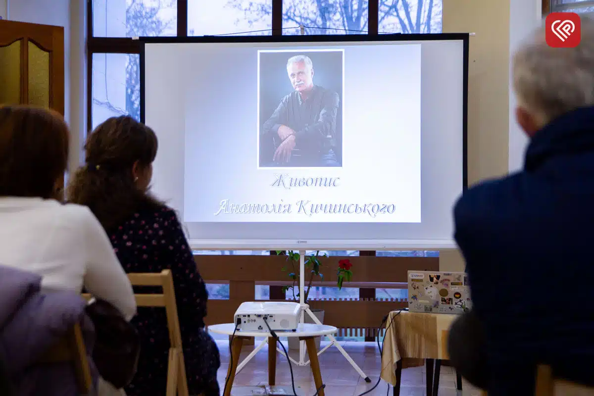 Присутнім показали фотопрезентацію картин – слайди, кожен з яких Кичинський коментував та розповідав про створення чи іншого твору. Зізнався, дві його картини росіяни вкрали під час окупації, а ще кілька робіт із презентації знаходяться в колекції його друзів та відомих земляків, як-от колишнього мовного омбудсмена Тараса Кременя.