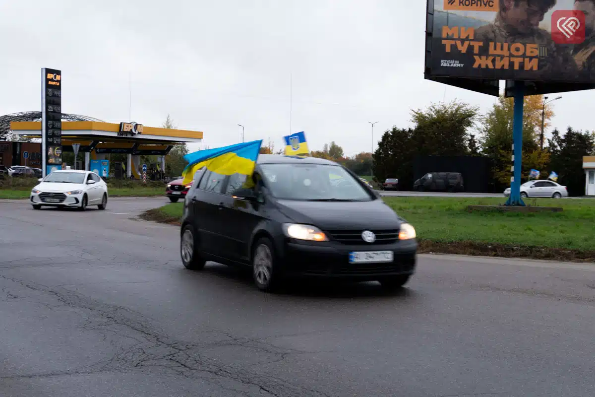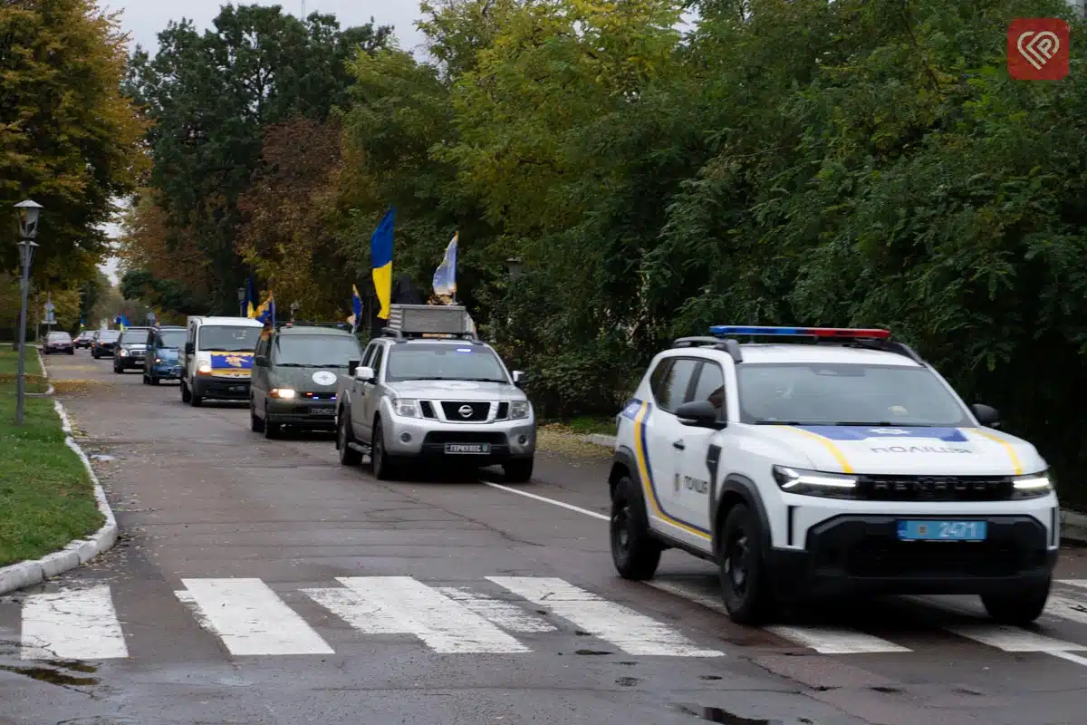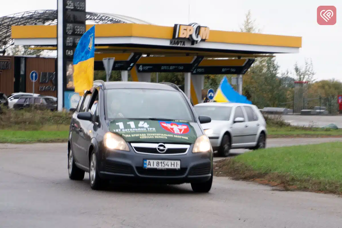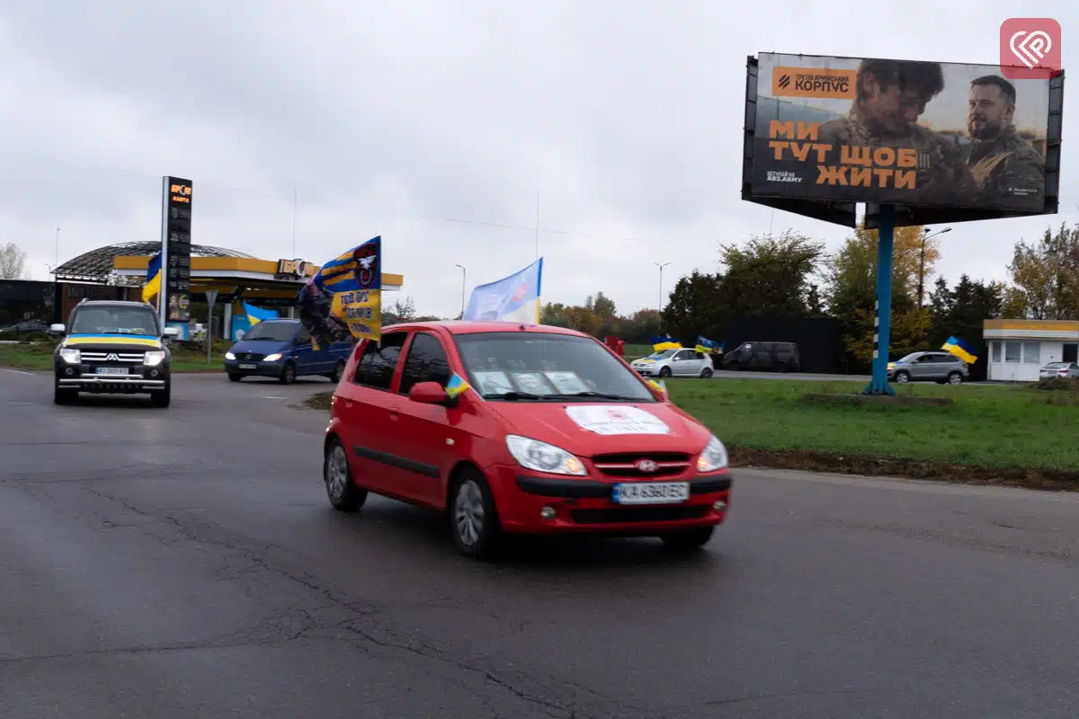 О 9:35 з площі рушила колона із близько сотні автомобілів. Порядок та супровід забезпечували правоохоронці. На кожному авто майоріли державні прапори, стяги військових частин, а також плакати із зображеннями воїнів та гаслами: