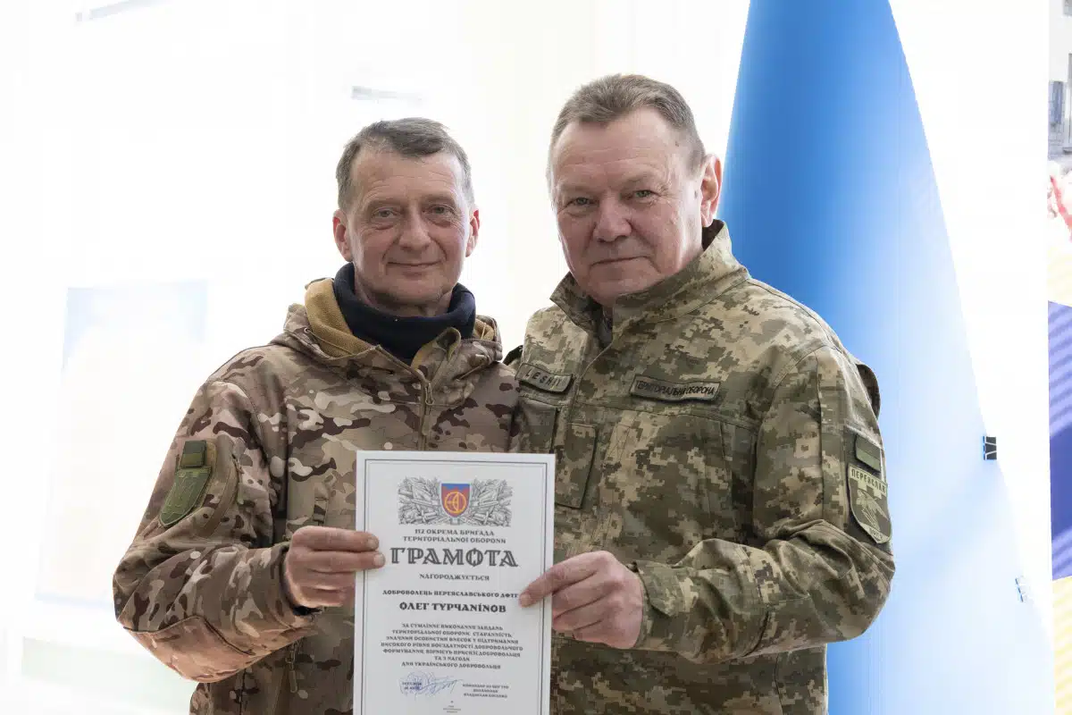 «25 лютого 2022 року я звернувся до колективу із закликом створити добровольчий загін. Тоді нам бракувало всього: зброї, боєприпасів, бойового досвіду. Але не бракувало головного – рішучості. Уже за два дні наші добровольці організували цілодобові чергування. Так народилася історія ДФТГ-2 «Переяслав», – пригадав Віталій Вікторович.