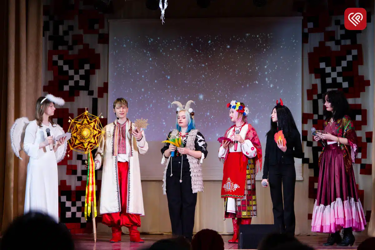 Вихованці студії конферансу «Акцент» під керівництвом Влади Черненко представили театралізоване дійство про різдвяний вертеп. У ролі колядників вони виконували функцію ведучих програми, а між номерами знайомили глядачів із давніми українськими традиціями, обрядовими дійствами та ворожіннями, відтворюючи колорит та дух народного святкування Різдва.