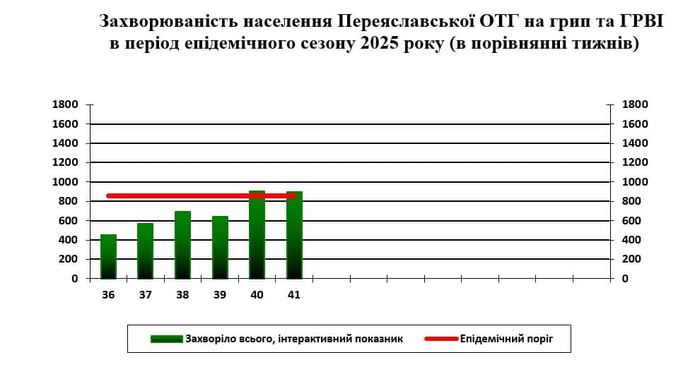 За результатами епідеміологічного моніторингу, за останній тиждень у Переяславській громаді на грип та ГРВІ захворіли 322 особи. Інтенсивний показник становить 899,1 на 100 тисяч населення, що на 4,5% вище епідемічного порога (858,8), розрахованого для Київської області.