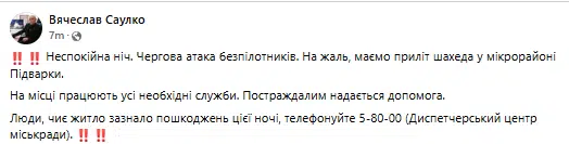«Неспокійна ніч. Чергова атака безпілотників. На жаль, маємо приліт шахеда у мікрорайоні Підварки. На місці працюють усі необхідні служби. Постраждалим надається допомога», – написав мер.
