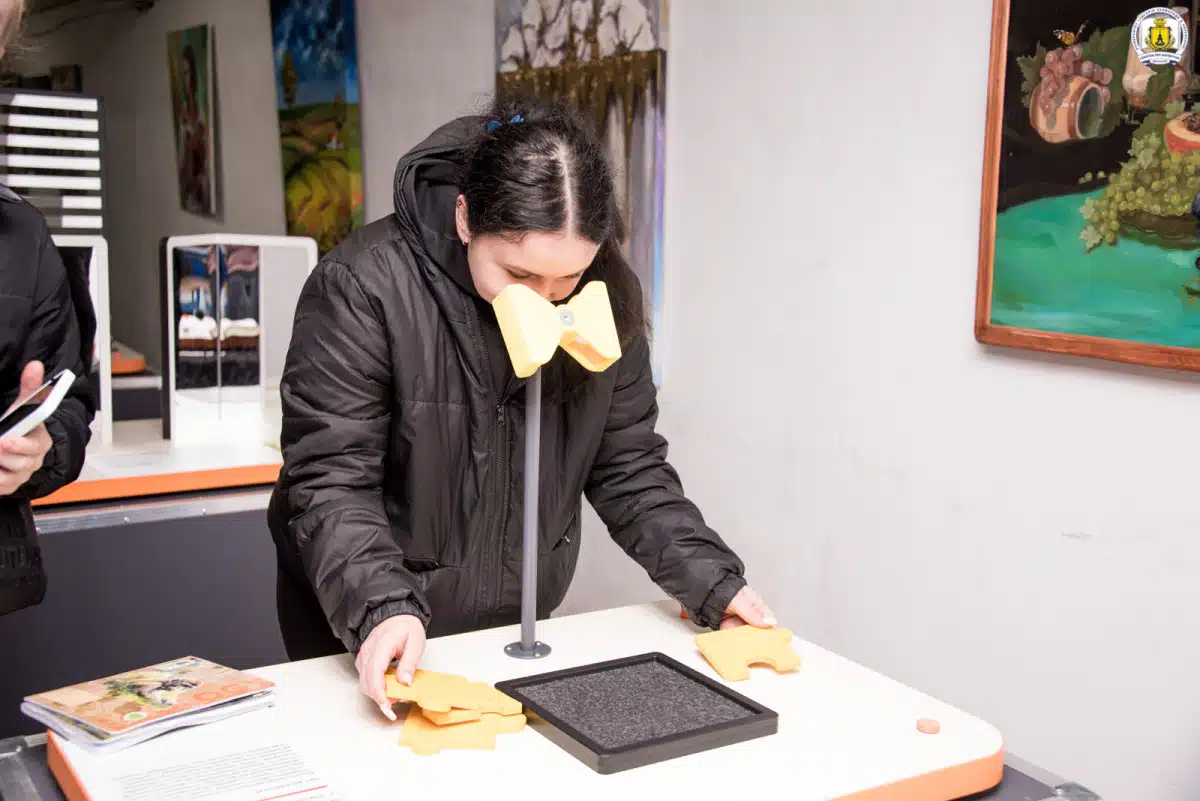 У виставковій залі, що знаходиться в укритті під першим корпусом університету, представлено 13 експонатів, які спрямовані покращити навчальний процес та допомогти здобувачам освіти краще засвоїти матеріал. Тут все присвячено людині та її тілу, органам чуття та сприйняття. Це експериментальний проєкт, який дасть змогу педагогам доповнювати її різними експериментами.