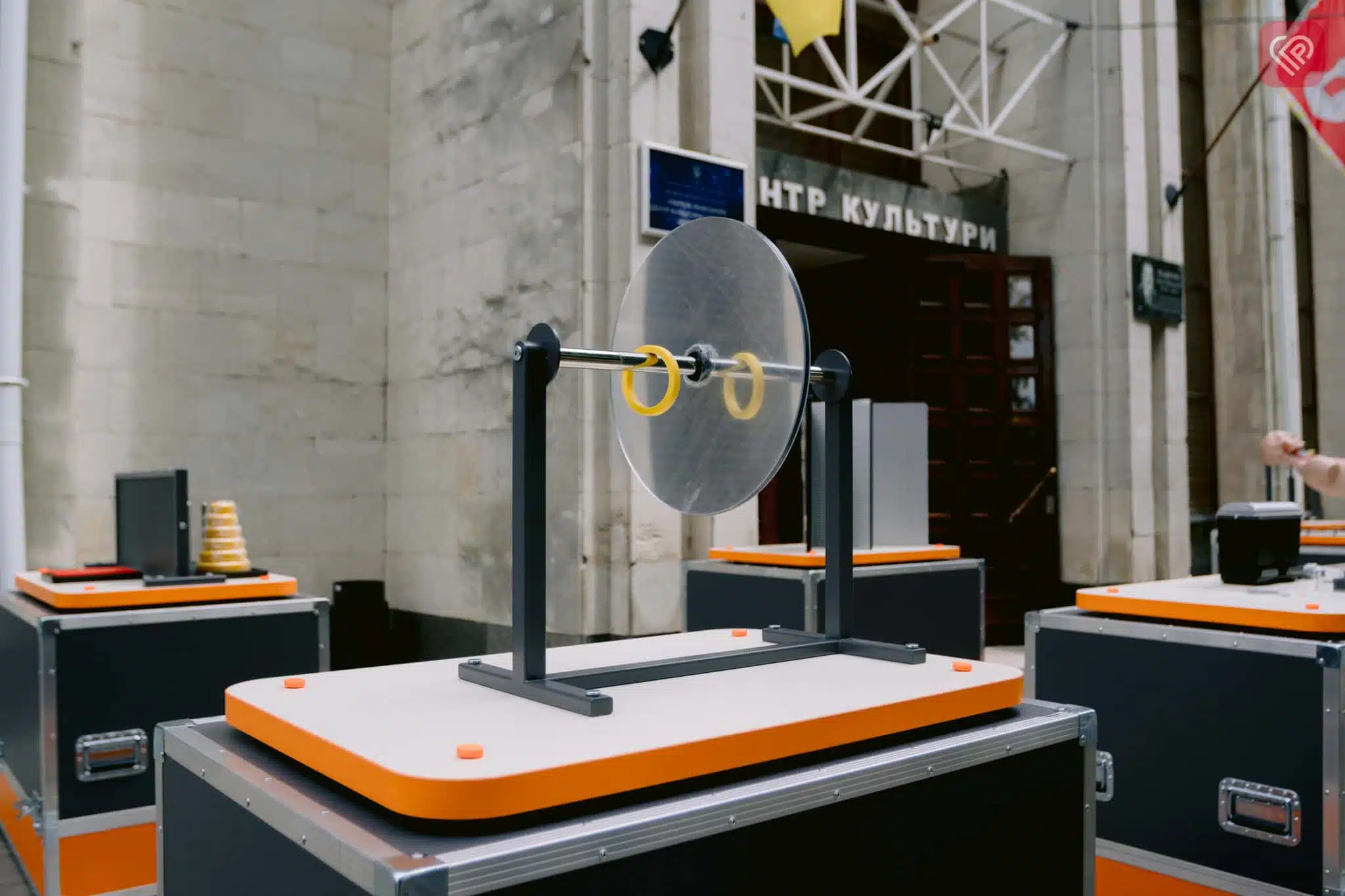 - Рівновага. Експонат допоможе зрозуміти, як працює вестибулярний апарат людини. Треба стати на півкулю і провести кульку по лабіринту. Тиск у півсфері регулюється у залежності від віку та здібностей учня.