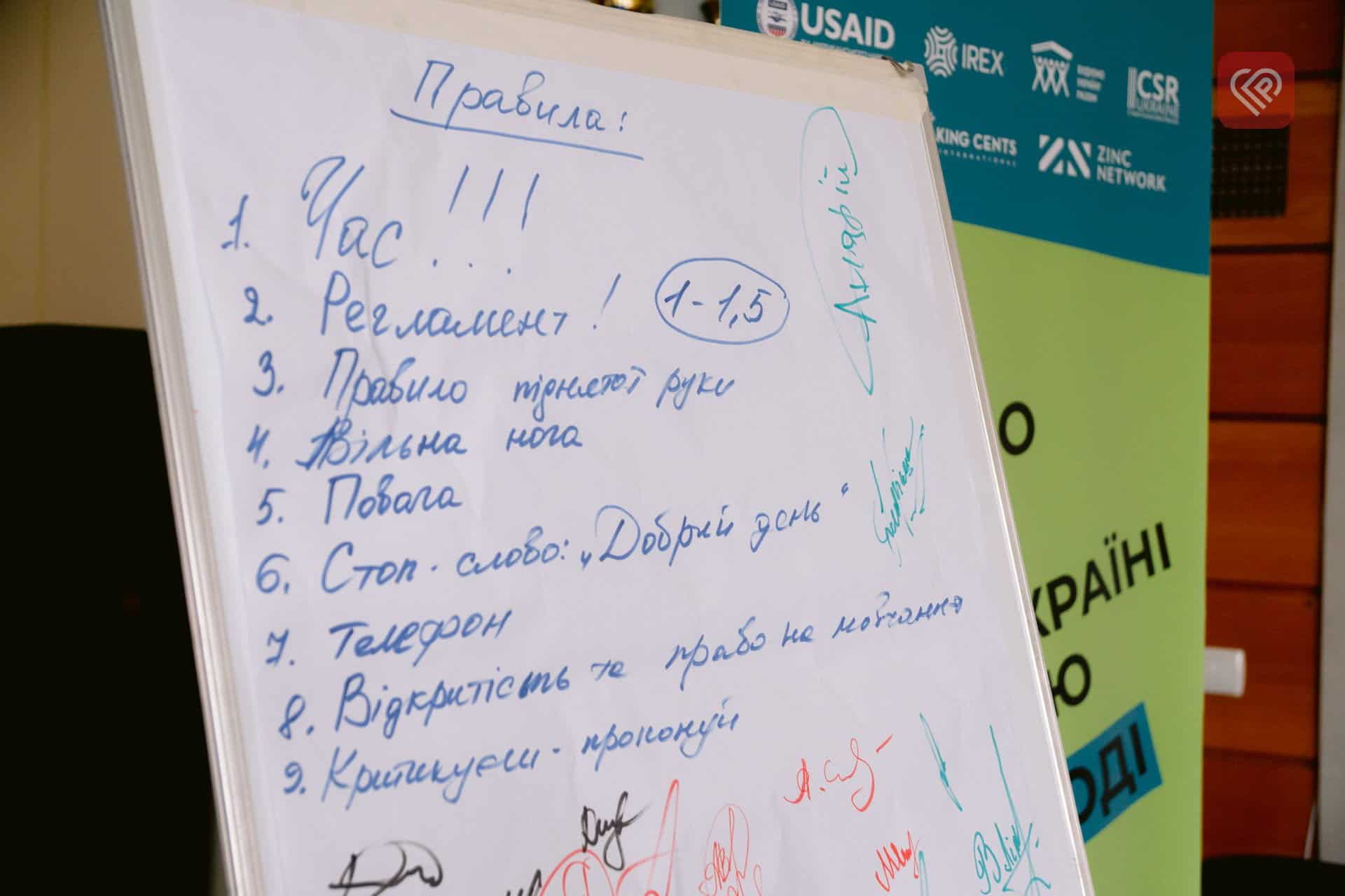 Під час діалогу разом з учасниками та учасницями ознайомлювалися з програмою «Незламна молодь: молодіжні ради»; формували ментальну карту проблем та ідей молоді у громаді; проводили мозковий штурм потреб молоді та роботи з ВПО; робили SWOT-аналіз роботи молодіжної ради з урахуванням безбар’єрності: опрацювали молодіжну програму громади та промоніторили фінансування на неї з місцевого бюджету; поговорили про успішні кейси молодіжних рад й проаналізували механізми та інструменти для захисту прав молоді.