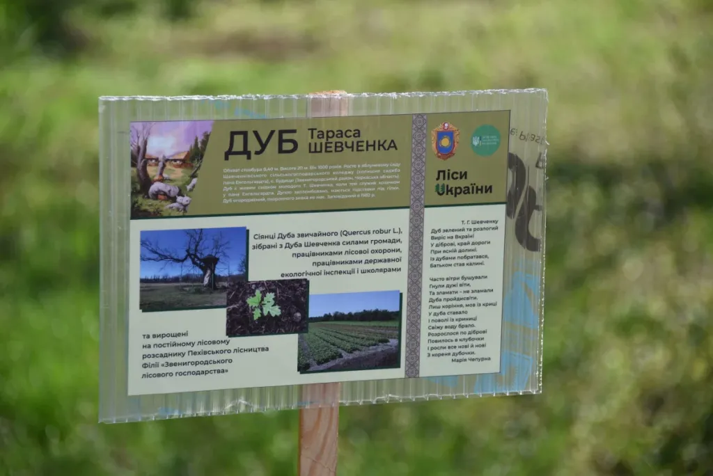 Перші саджанці вирощені з жолудів Тарасового дуба (с. Будище Звенигородського р-ну Черкаської обл.) на постійному лісовому розсаднику Пехівського лісництва Філії «Звенигородського лісового господарства» висадили у минулий вівторок, 18 квітня 2023 року, біля «Музею Заповіту Т. Г. Шевченка» де відбулося відзначення 15-річчя з нагоди його відкриття.