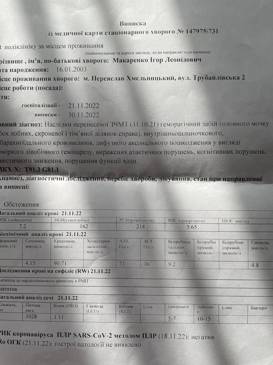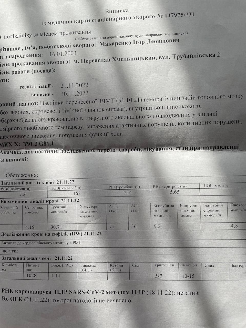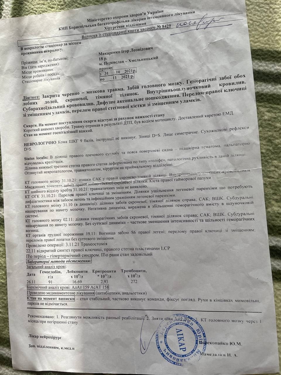 «Нині Ігорю треба невідкладно пройти реабілітацію, інакше він і надалі погано ходитиме і говоритиме. Він пройшов чималий шлях у лікуванні тож давайте разом допоможемо хлопцю повернутися до нормального життя», – звертається друг Макаренка, переяславець Євгеній Карабанов надаючи супровідні документи, що свідчать про діагноз: