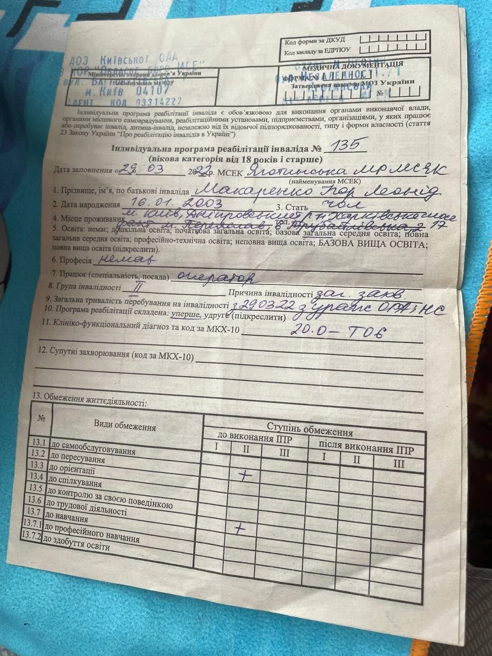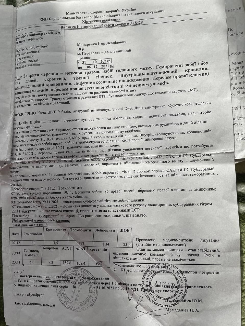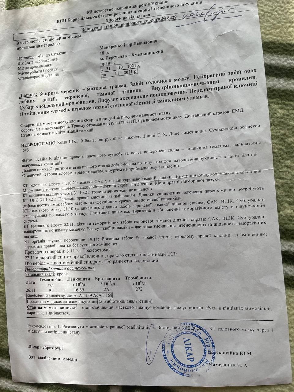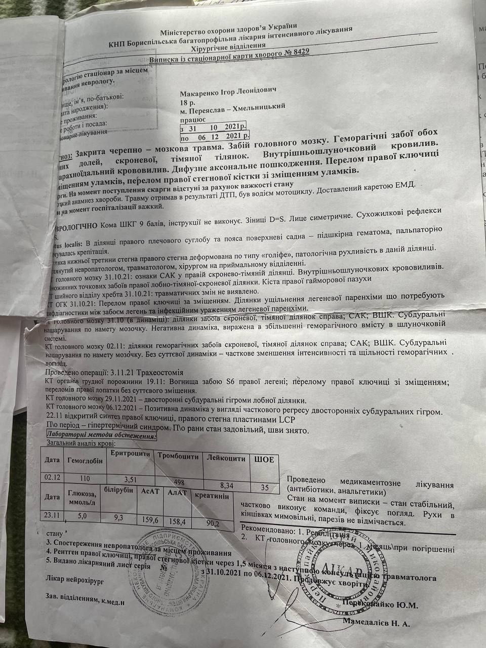 «Нині Ігорю треба невідкладно пройти реабілітацію, інакше він і надалі погано ходитиме і говоритиме. Він пройшов чималий шлях у лікуванні тож давайте разом допоможемо хлопцю повернутися до нормального життя», – звертається друг Макаренка, переяславець Євгеній Карабанов надаючи супровідні документи, що свідчать про діагноз: