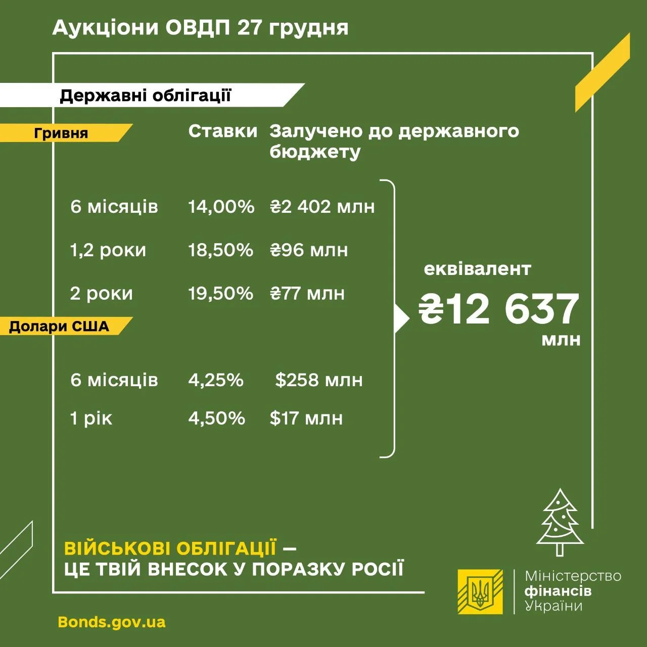 «Сьогодні, на останніх аукціонах ОВДП в цьому році, Міністерство фінансів України розмістило державні облігації на суму понад 12,6 млрд грн в еквіваленті», – повідомляє Мінфін.