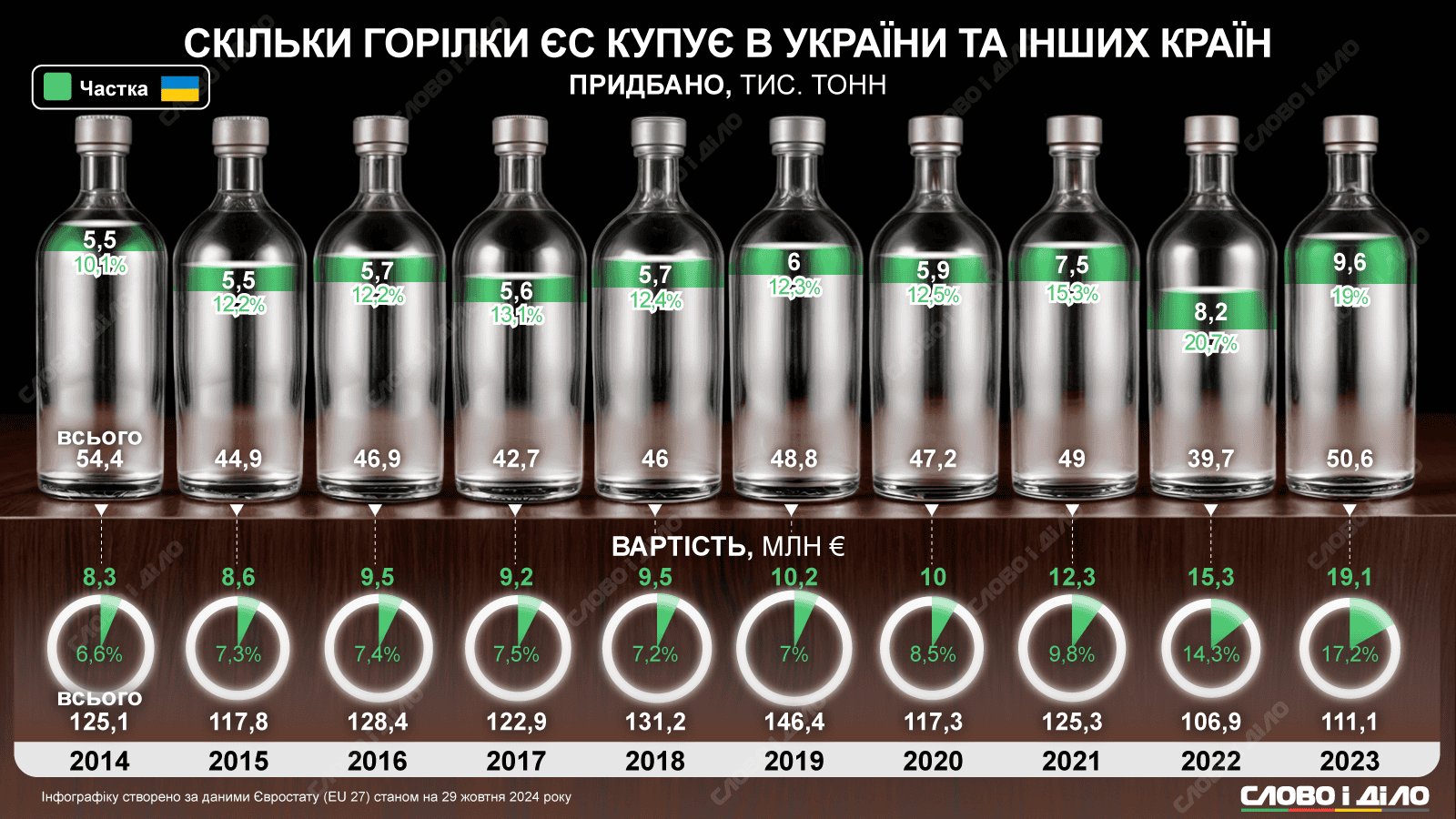 - 2014: ЄС імпортував 54,4 тис. тонн горілки, з яких 5,5 тис. тонн (10,1%) – українська. Вартість – 8,3 млн євро.