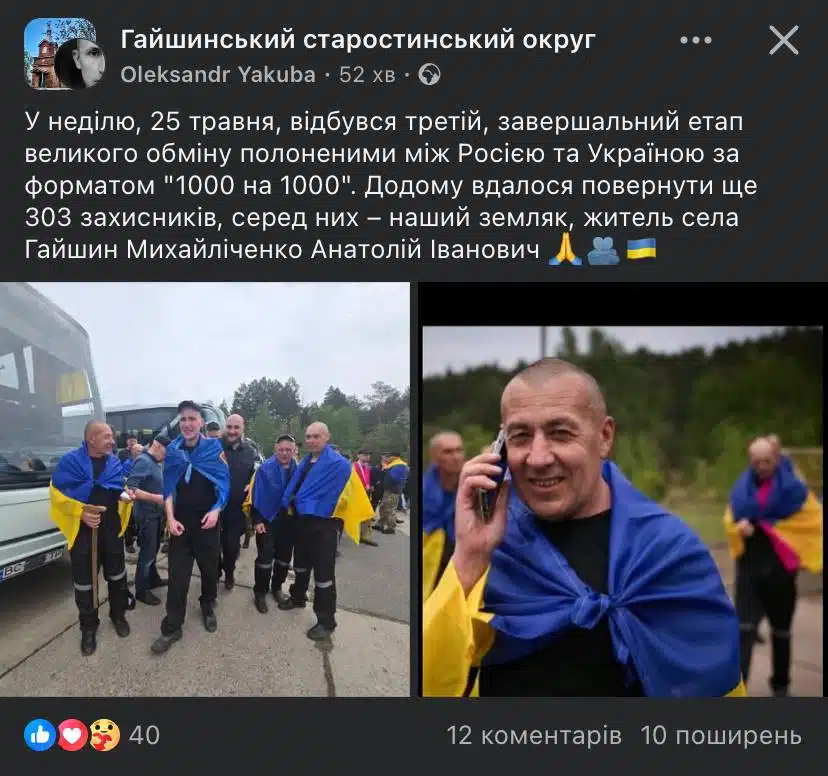 Серед звільнених – наш земляк, житель села Гайшин Переяславської громади Михайліченко Анатолій Іванович. Про це повідомив колишній староста Гайшинського округу Олександр Якуба.
