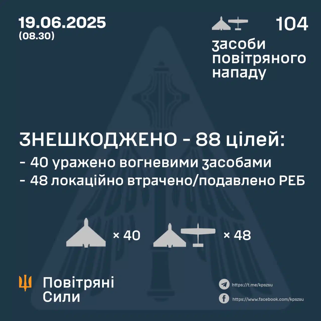 За даними Повітряних Сил, у ніч на 19 червня противник атакував 104 ударними БпЛА типу Shahed і безпілотниками-імітаторами.