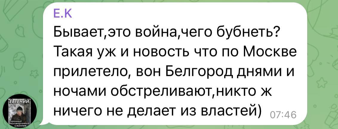 Реакція росіян на цю атаку красномовна. Переважна більшість населення цієї країни задоволена тим, що у москві пролунали вибухи. Однак це не перехід на проукраїнську позицію. Це радше старовинна московицька традиція «добре, коли сусіду погано».