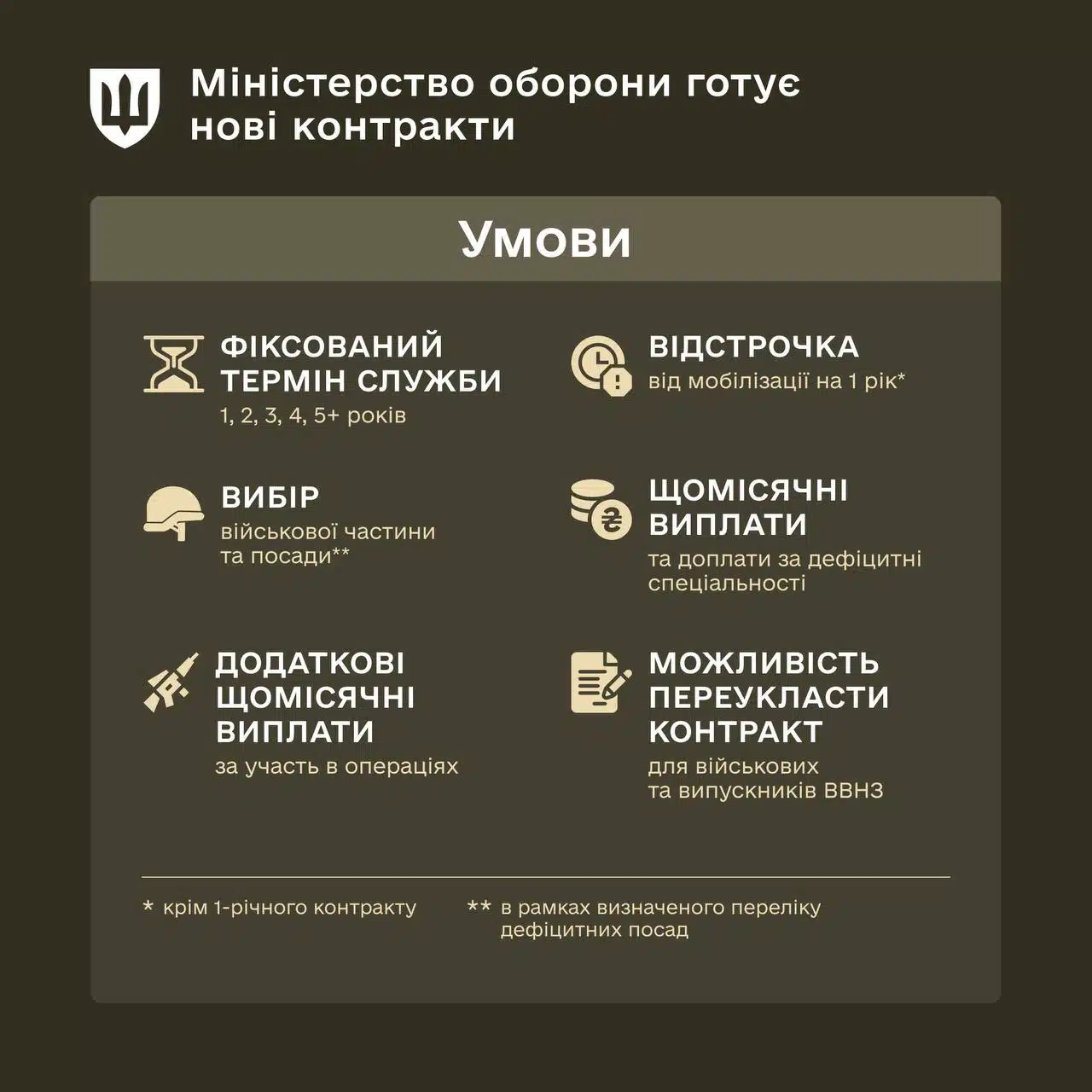 «Контракти будуть від 1 до 5 років. Для контрактів на 2-5 років передбачено річну відстрочку від мобілізації по завершенні контракту, – пояснив він.