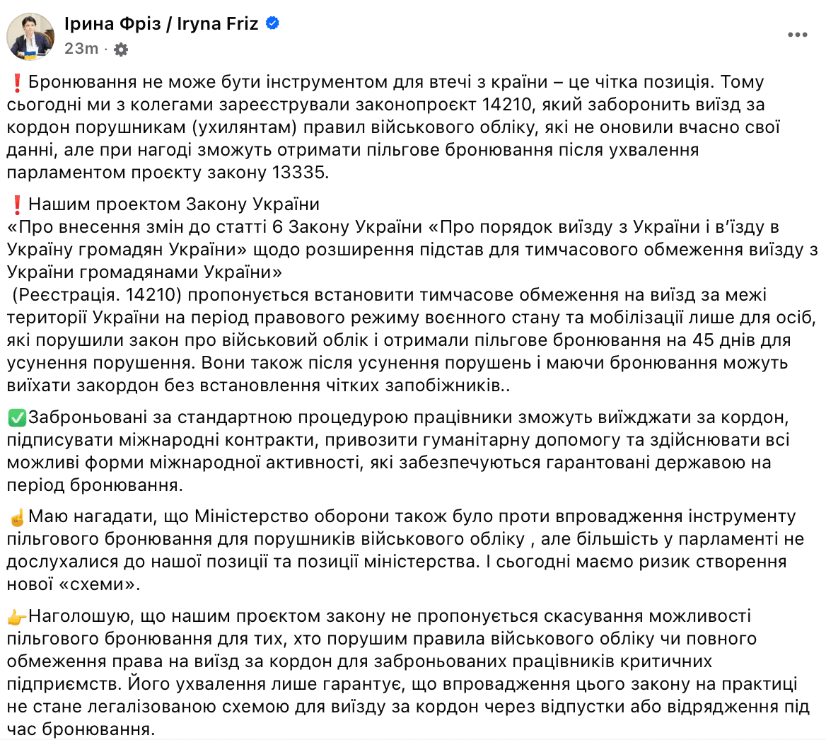 Співавторка законопроєкту Ірина Фріз у Facebook наголосила, що бронювання не може слугувати способом уникнути перебування в Україні.