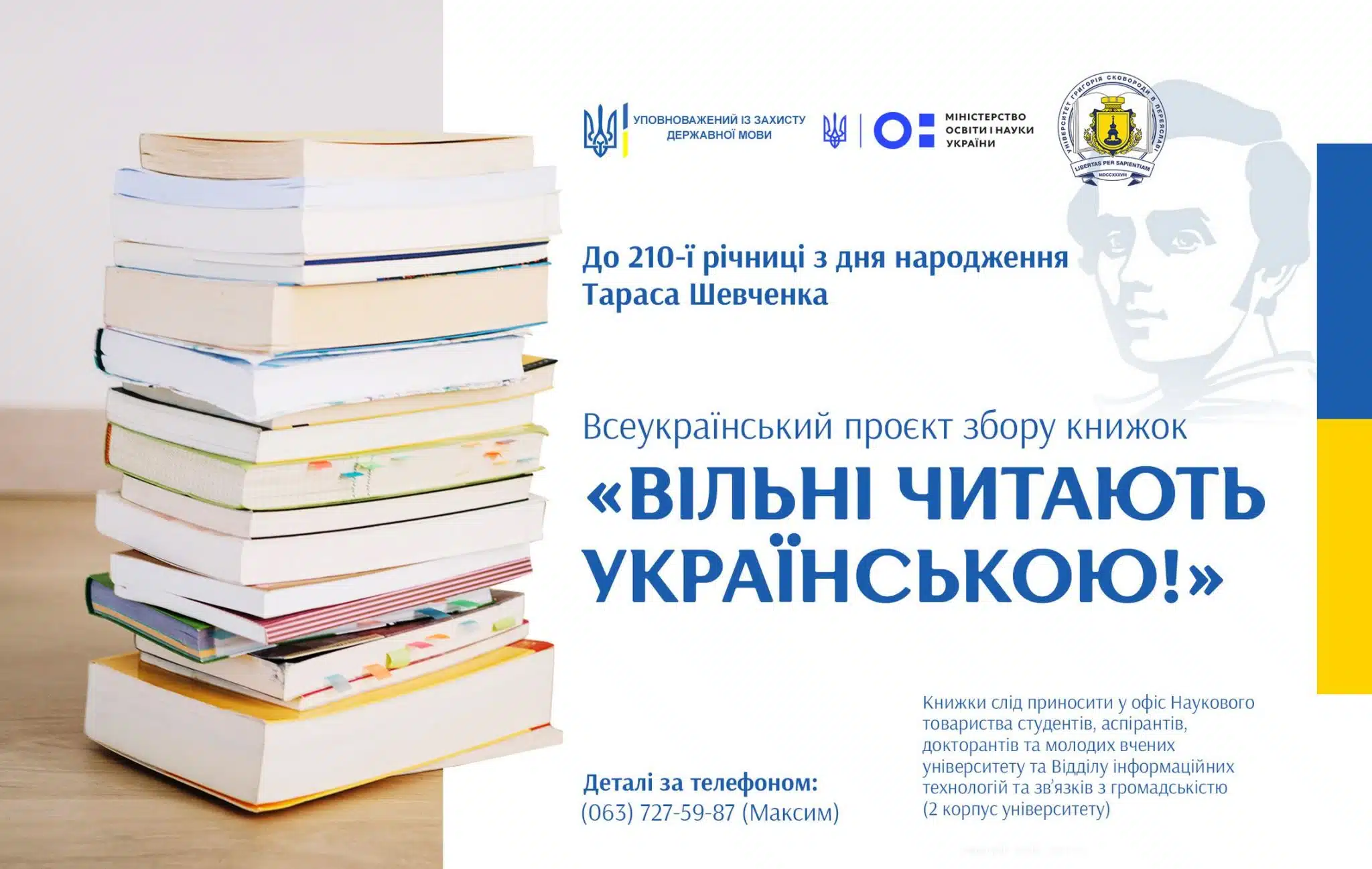 З нагоди відзначення 210-ї річниці з дня народження Тараса Шевченка Університет Григорія Сковороди в Переяславі разом з Уповноваженим із захисту державної мови Тарасом Кременем, за підтримки Міністерства освіти і науки України й проєкту «Єдині» співзапочатковує Всеукраїнський збір книжок «Вільні читають українською». На сайті університету розповіли про те, як до акції можуть долучитися усі охочі переяславці, передає Proslav.