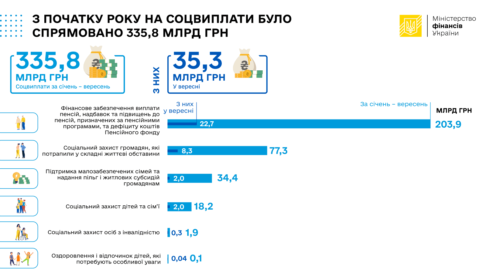 • 203,9 млрд грн, із них  у вересні –  22,7  млрд грн на фінансове забезпечення виплати пенсій, надбавок та підвищень до пенсій, призначених за пенсійними програмами, та дефіциту коштів Пенсійного фонду;