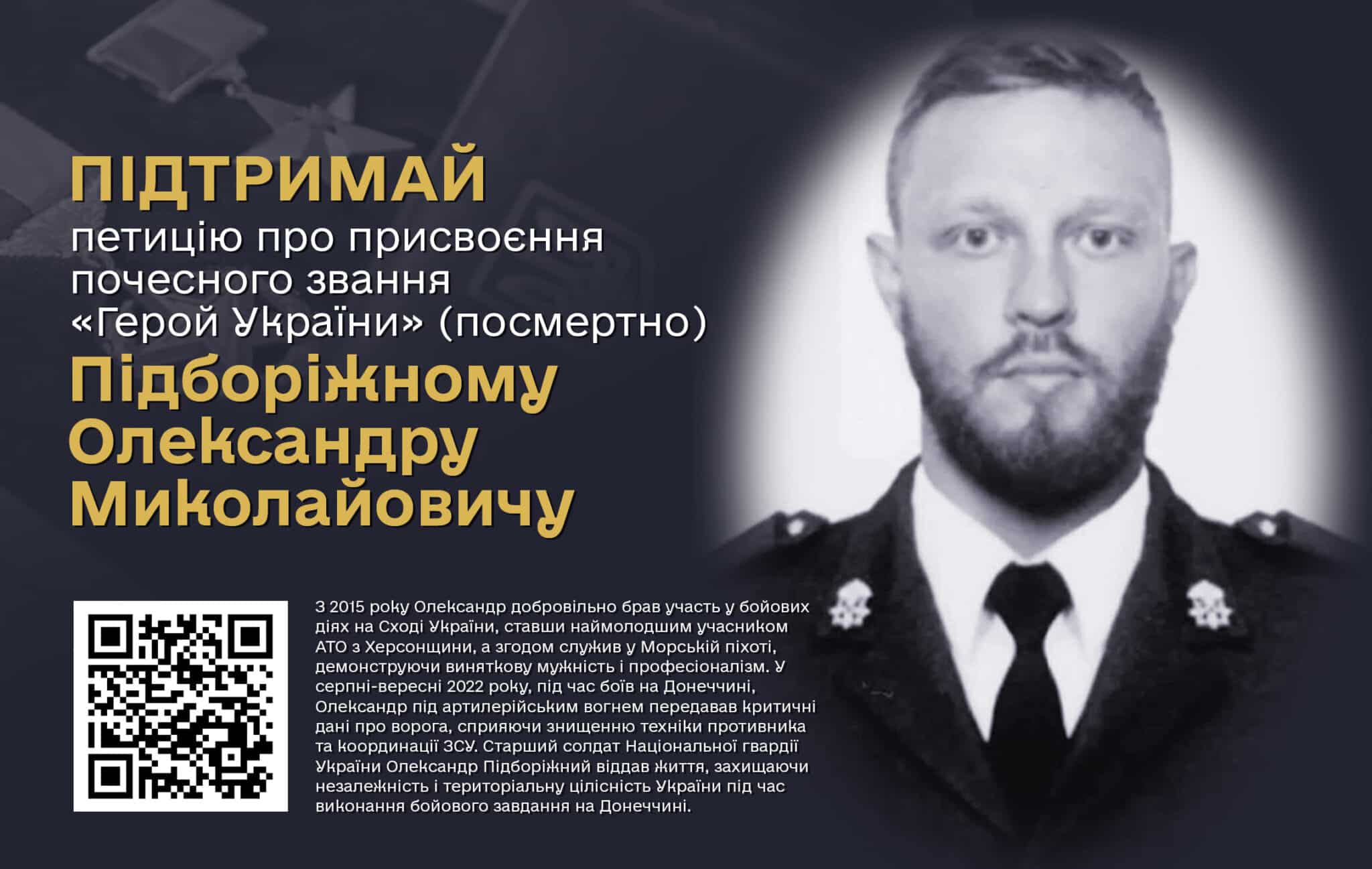 З ініціативи батьків Олександра Підборіжного наприкінці вересня на сайті Президента України було подано петицію №253172, щоб Олександру присвоїли звання Героя України (посмертно).
