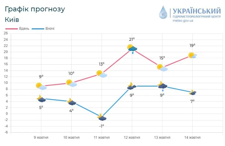 Загалом з 9 по 14 жовтня на Київщині переважатиме погода без опадів, лише вдень 12 та вночі 13 жовтня місцями невеликий дощ.