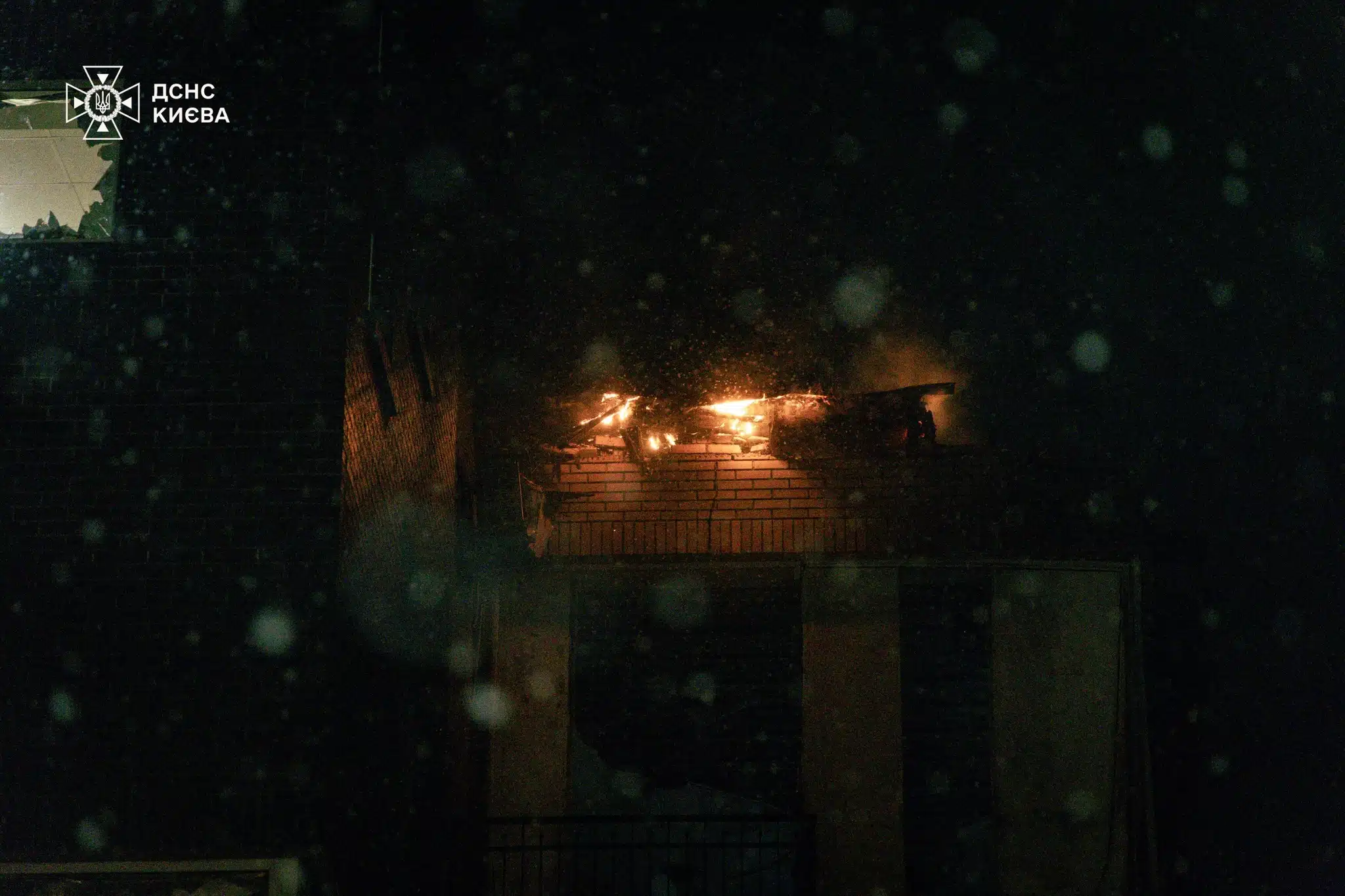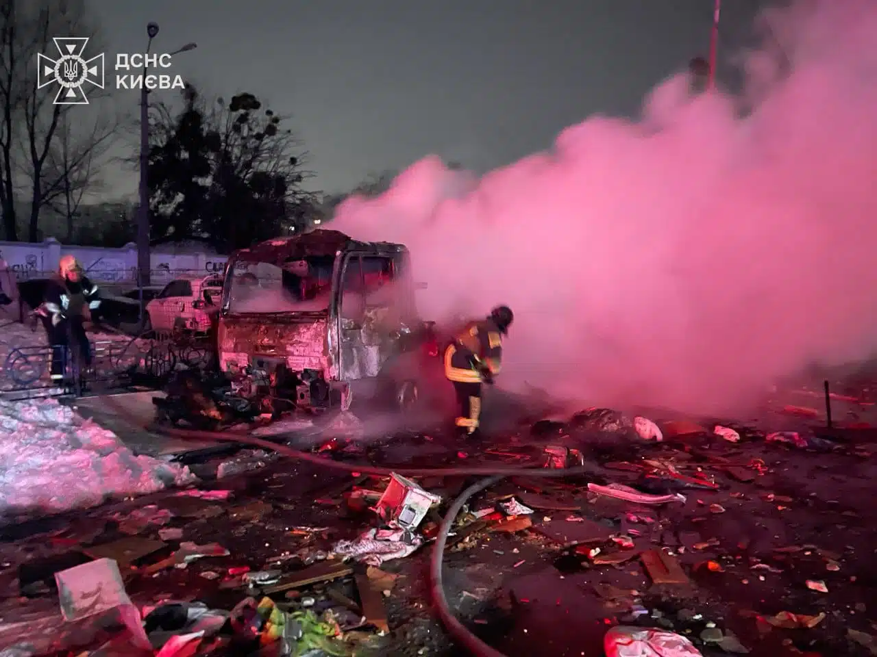 У Шевченківському районі уламки ворожого дрона влучили в дах чотириповерхової офісної будівлі, що спричинило загоряння покрівлі. У Дарницькому районі зафіксовано падіння уламків біля кафе, розташованого в житловому будинку – без пошкодження самої споруди. В Оболонському районі уламки БпЛА впали на стоянку, внаслідок чого загорілися автомобілі.