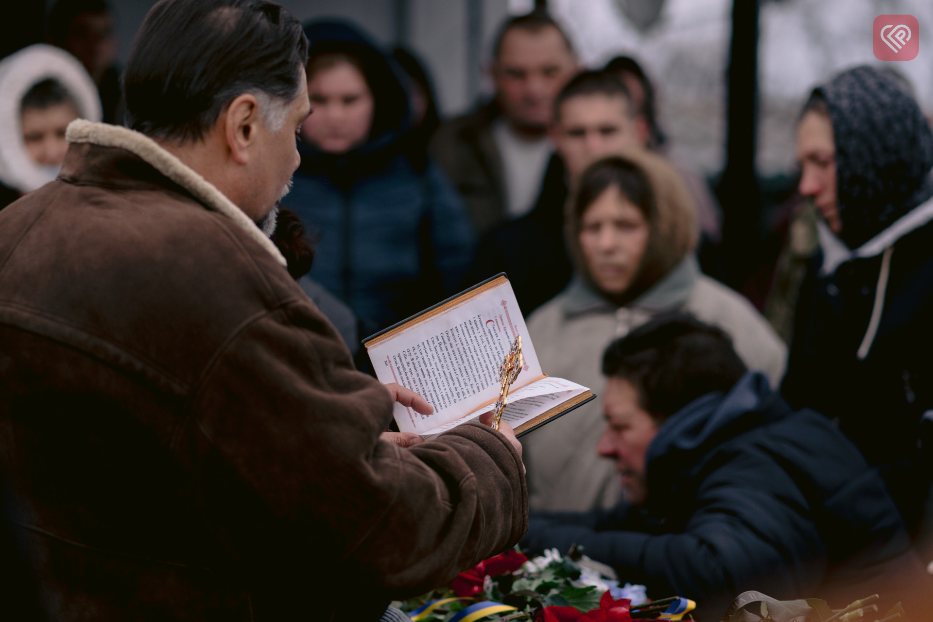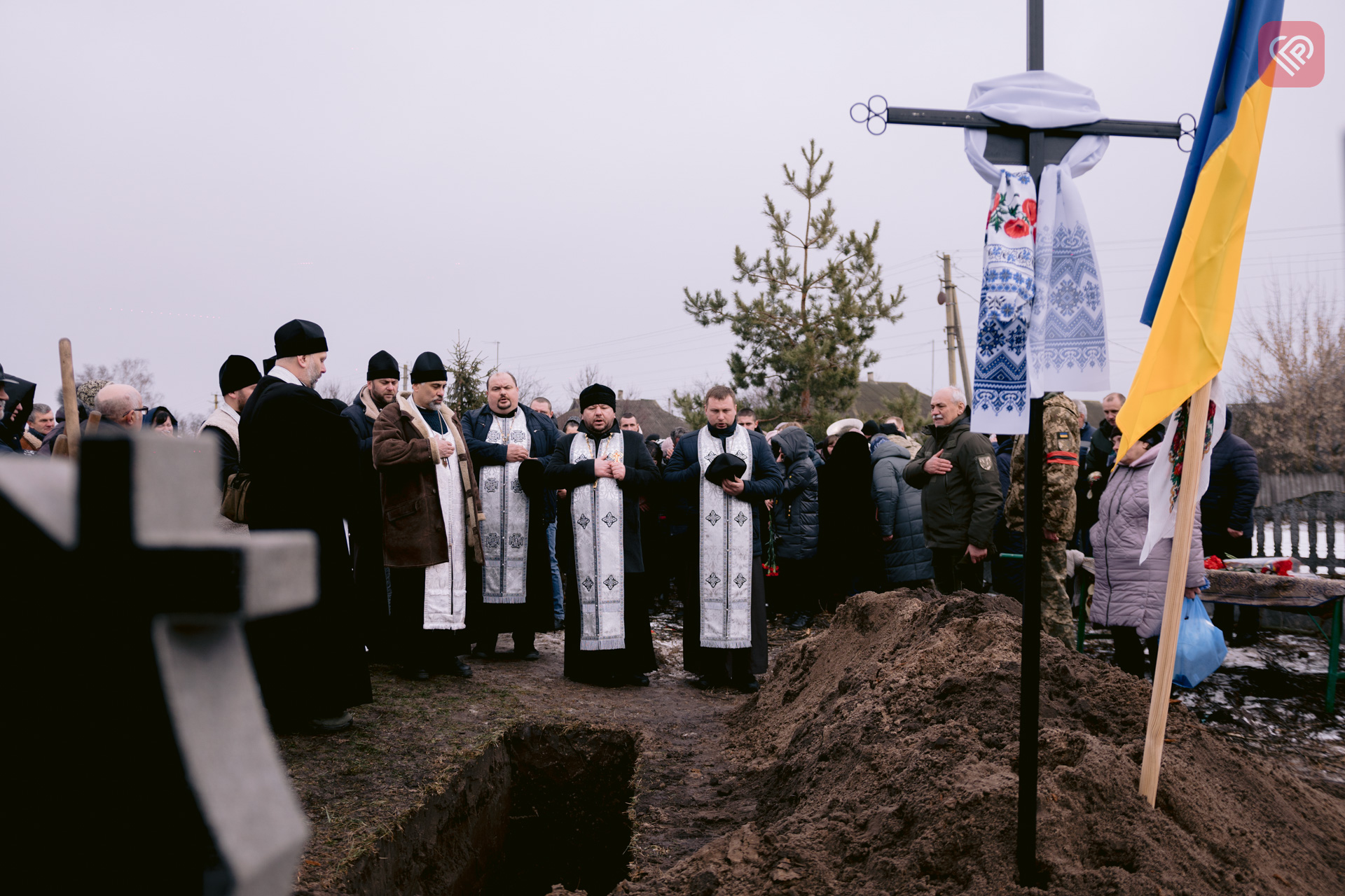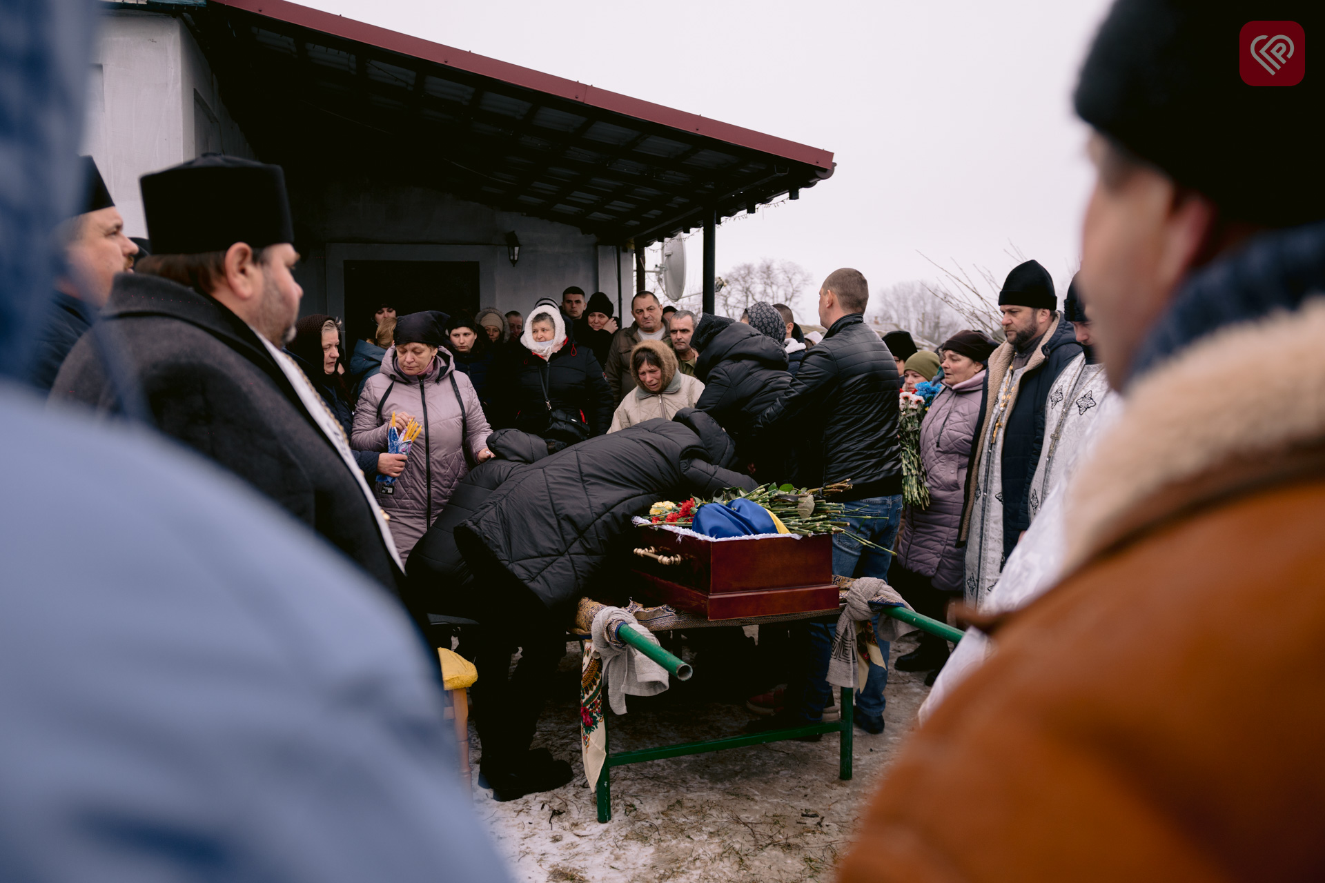 Земляки зустріли траурний кортеж навколішки та провели до будинку на вулиці Покровській, де жив Сергій. Там, біля родинного помешкання, священники ПЦУ відслужили заупокійний молебень.