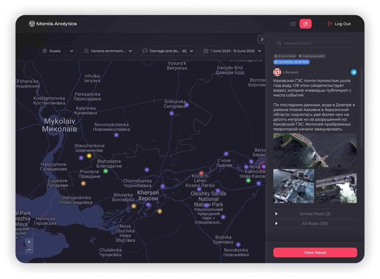 Mantis у режимі реального часу обробляє тисячі повідомлень та гігабайти даних зі ЗМІ, соцмереж, інформаційних платформ. Потім компонує все на інтерактивній карті.
