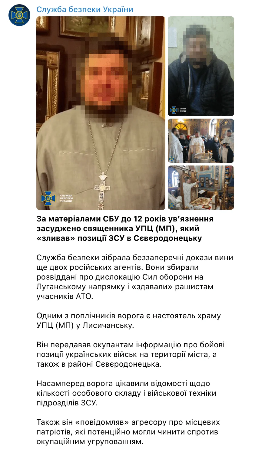 За матеріалами СБУ до 12 років ув’язнення засуджено священника УПЦ (МП), який «зливав» позиції ЗСУ в Сєвєродонецьку