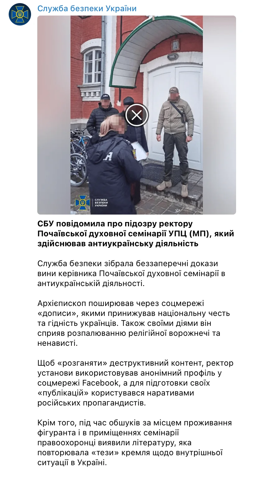 СБУ повідомила про підозру ректору Почаївської духовної семінарії УПЦ (МП), який здійснював антиукраїнську діяльність