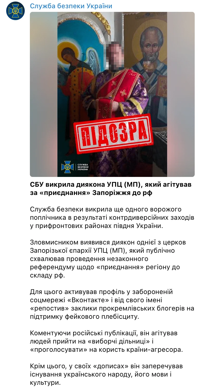 Також викрито диякона УПЦ (МП), який агітував за «приєднання» Запоріжжя до рф