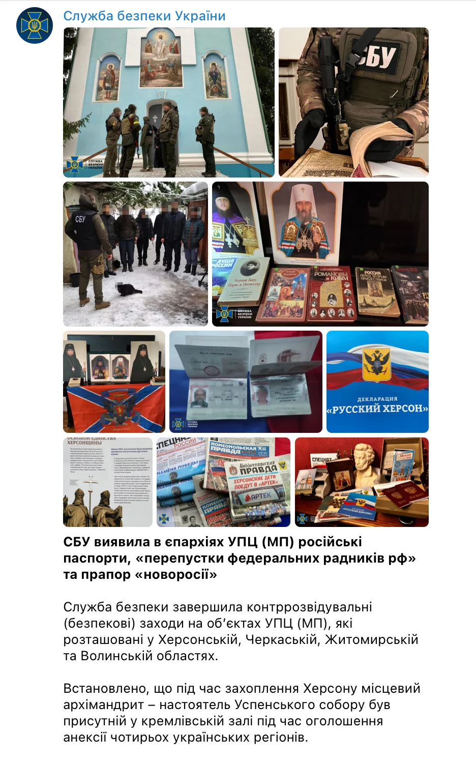 В єпархіях УПЦ (МП) СБУ виявила російські паспорти, «перепустки федеральних радників рф» і прапор «новоросії»