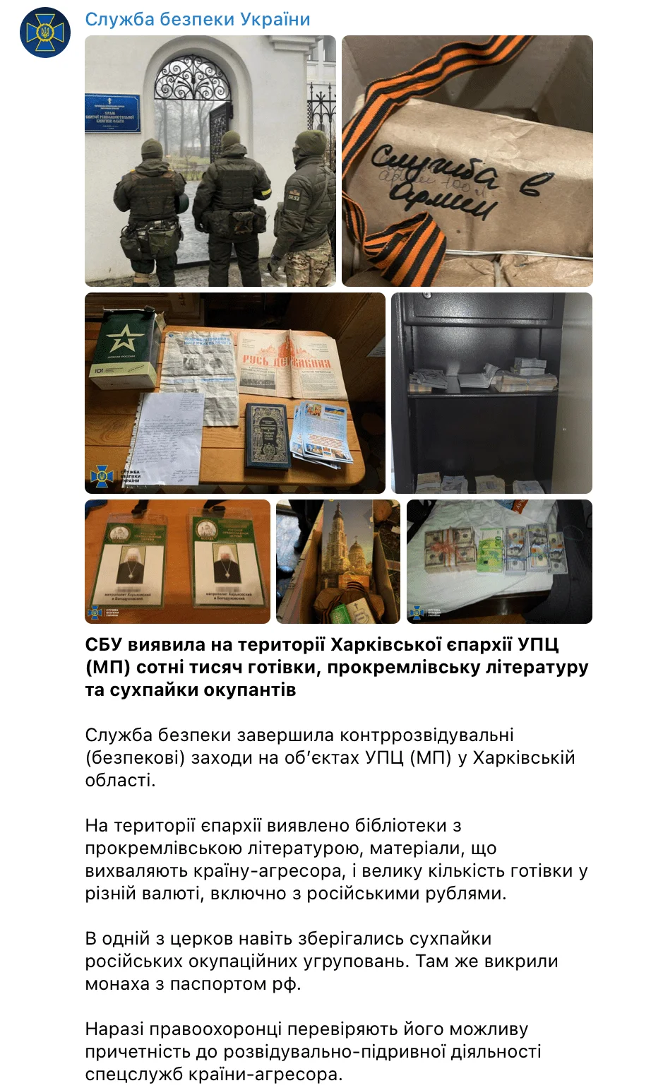У Харківській єпархії УПЦ (МП) знайшли сотні тисяч готівки, прокремлівську літературу та сухпайки окупантів
