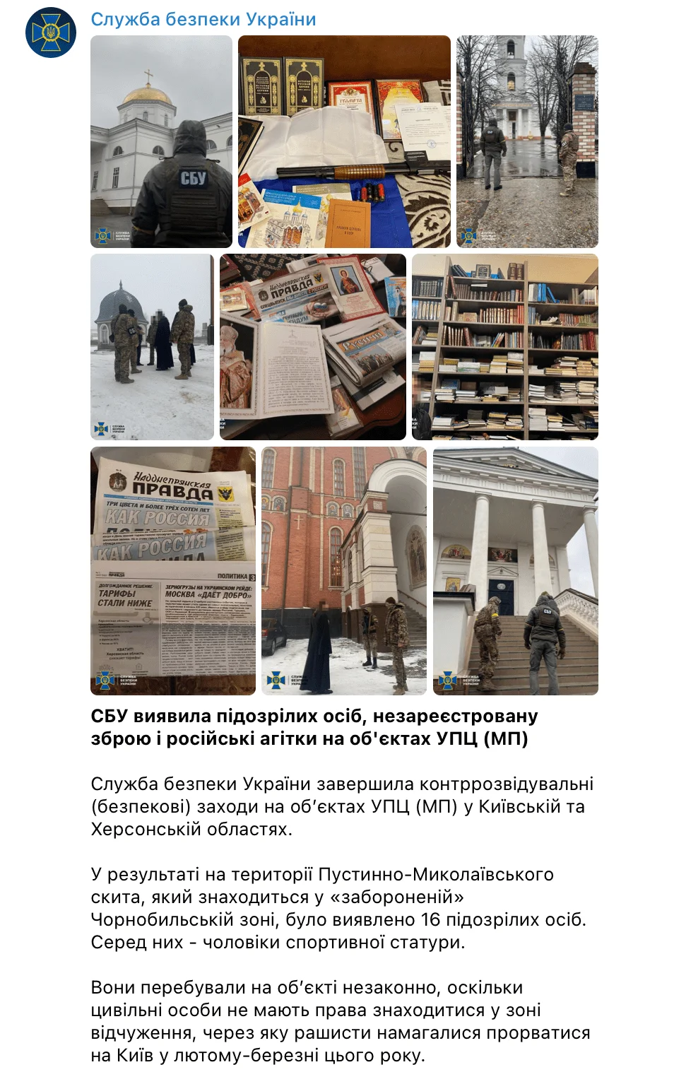 В Київській та Херсонській єпархії УПЦ (МП) – виявили підозрілих осіб, незареєстровану зброю і російські агітки