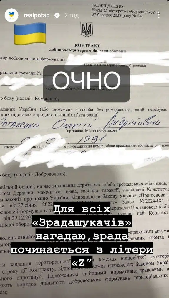 Серед іншого, Потап коментував свій заочний вступ до ТРО, куди його «записав батько»: