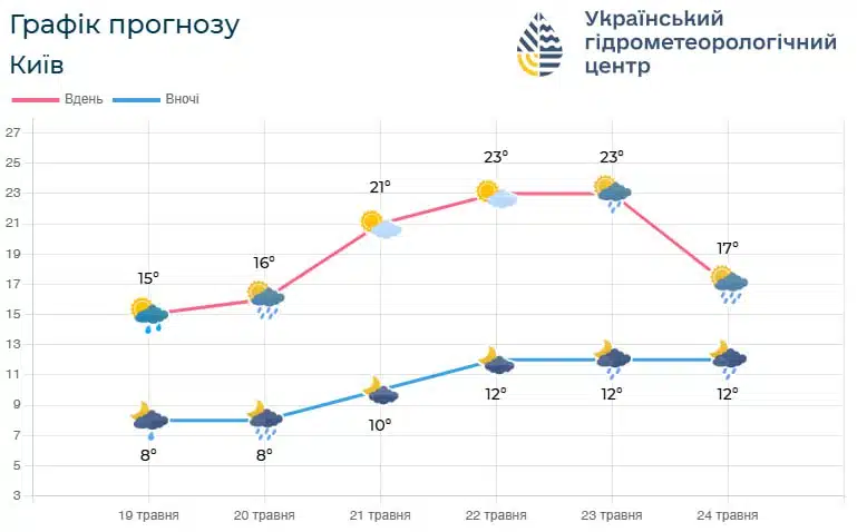Температура вночі складе 6-11°, а вдень повітря прогріється до 19-24° тепла. У Києві вночі термометри зафіксують 9-11°, а у денні години – 22-24° тепла.