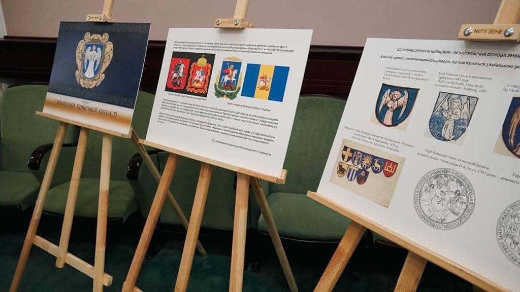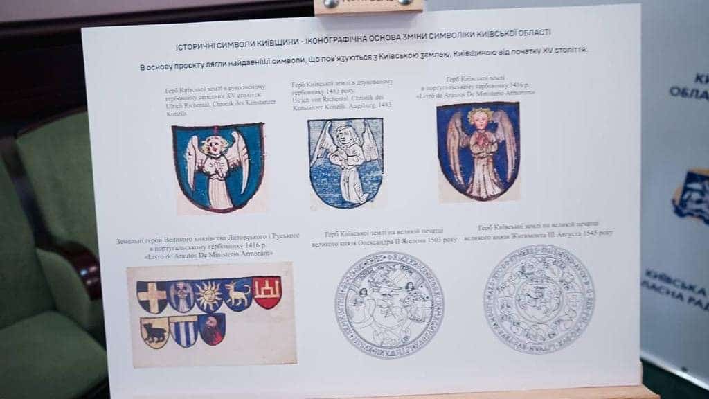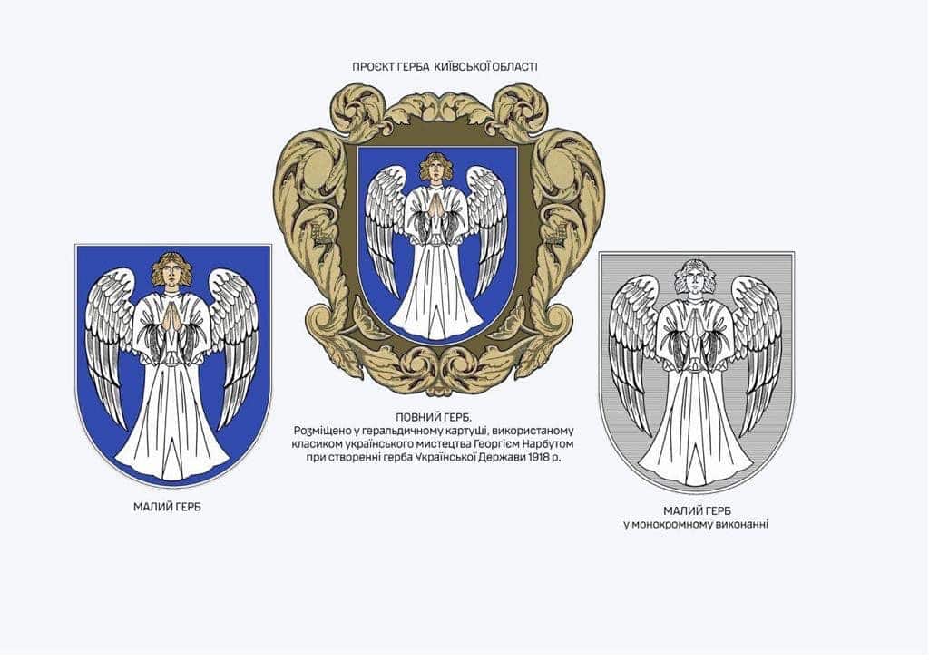 Відомо, що експерти робочої групи, яку координував заслужений художник і геральдист Олексій Руденко, пропонують розмістити на гербі Київської області янгола. Кажуть, саме ангел який молиться за Київщину та її мешканців, і стоїть на захисті, зафіксований в історичних документах на гербі Київської землі щонайменше з 1416 року. Поза тим герб з ангелом зображували і на великих державних печатках Великого князівства Литовського.