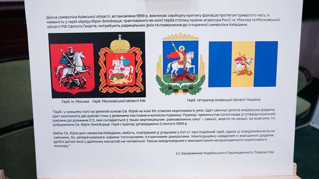 Очільник Київщини нарікає, що на гербі Київщини зображений Юрій Змієборець, який “копіює і нагадує” Георгія Победоносця на гербі московської області рф і москви. Відтак днями депутатам Київської обласної ради, керівникам громад і мерам міст презентували проєкт нового герба та прапора області Про це повідомляє голова Київської обласної військової адміністрації (ОВА) Руслан Кравченко, пише Proslav.