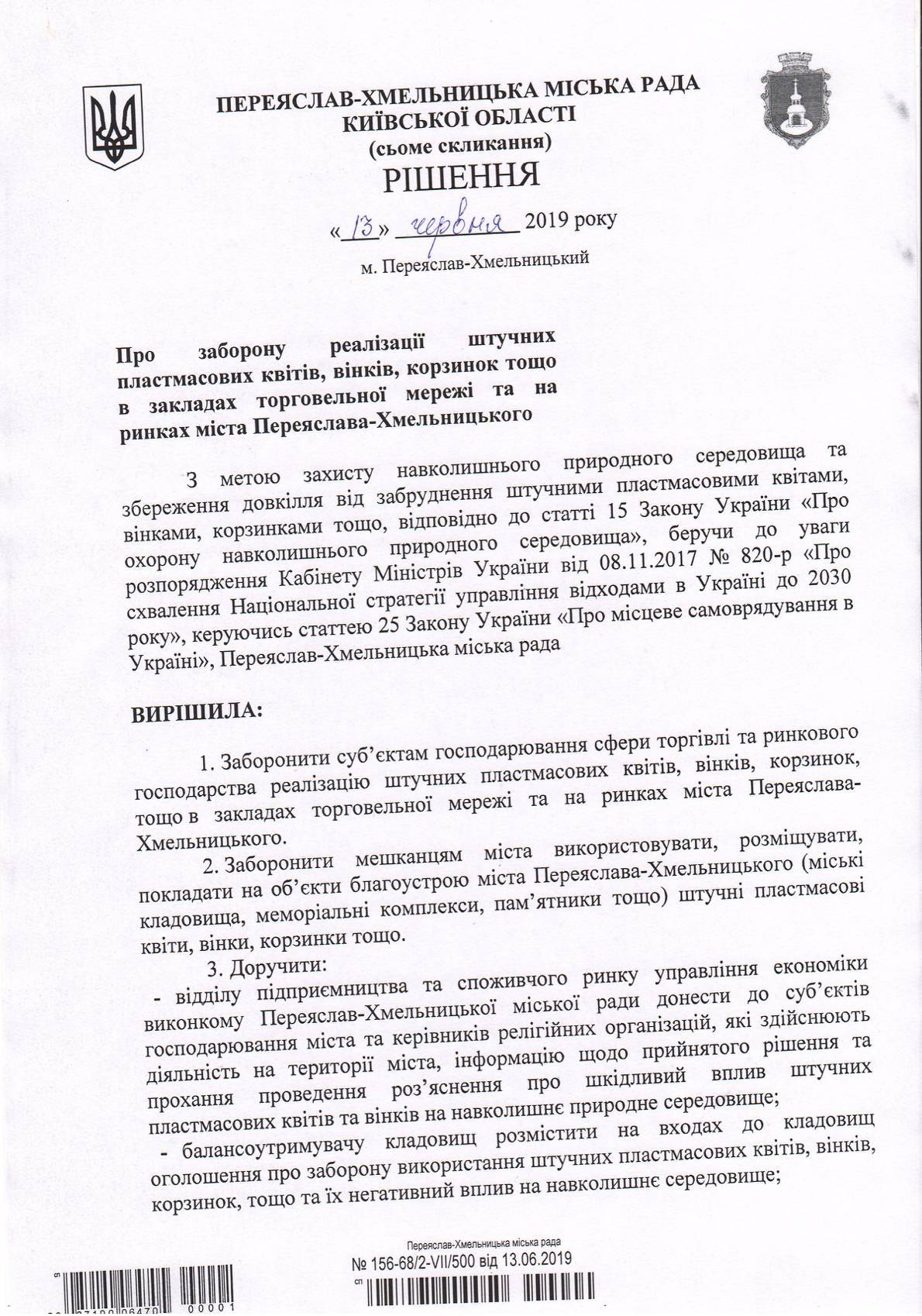 Під час чергового засідання Переяслав-Хмельницької міської ради, яке відбулося 13 червня 2019, було прийняте рішення про заборону реалізації штучних пластмасових квітів, вінків, корзинок тощо в закладах торгівельної мережі та на ринках міста Переяслав.