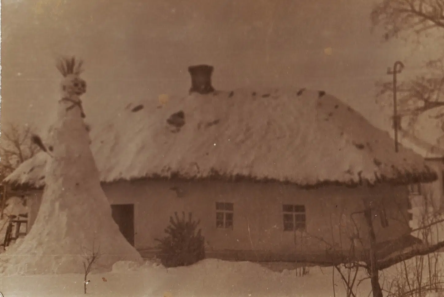 Музейники надають світлину, на якій зображене одне з перших снігових творінь Михайла на фоні старої батьківської хати. Як уточнює його донька Ольга Іщенко, це одна з перших скульптур її багатогранного батька, зліплена наприкінці 50-х років.