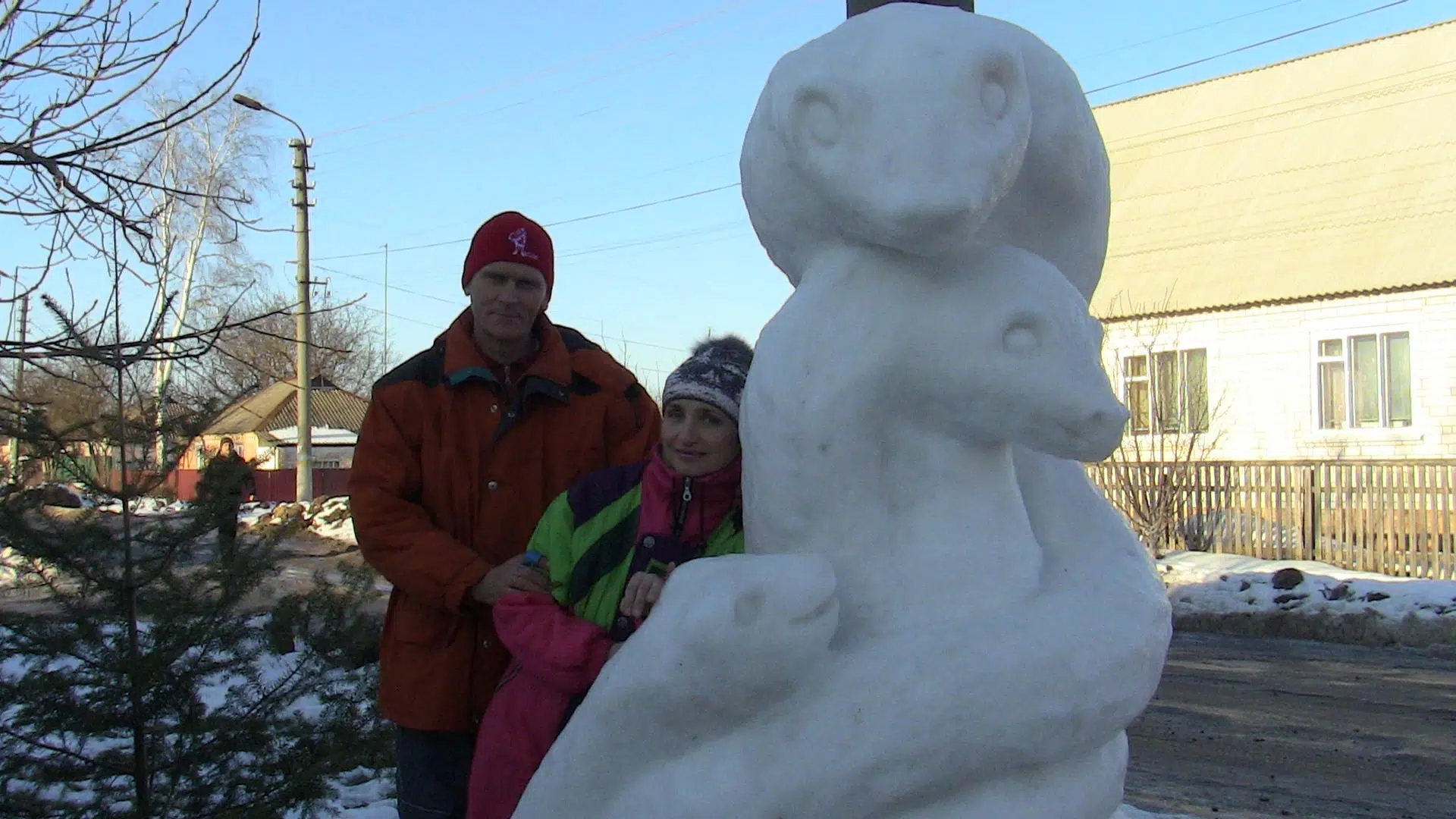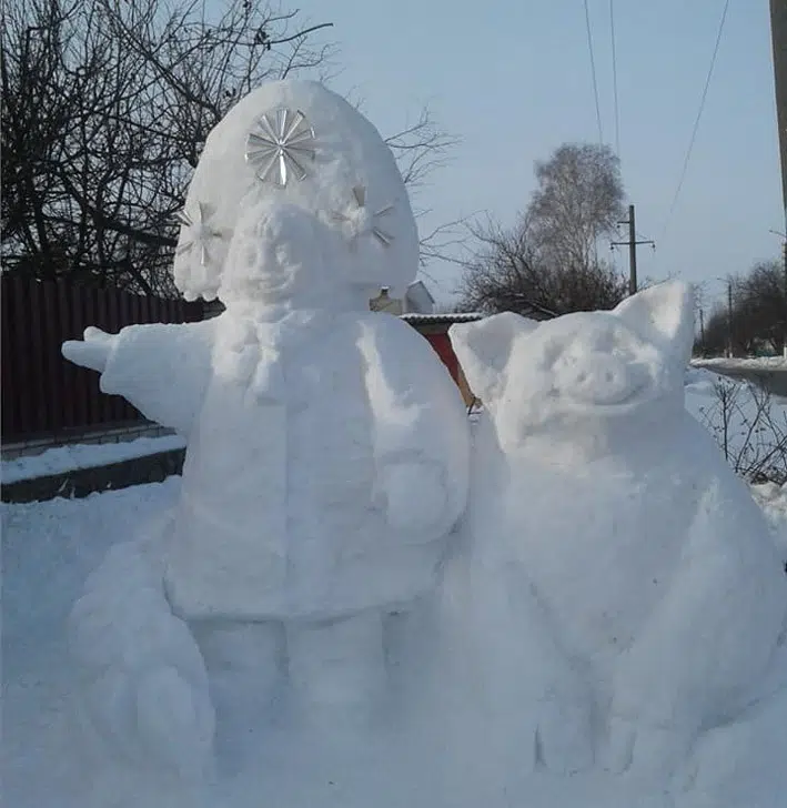 Скільки снігу йшло на виготовлення незвичайних скульптур, автор сказати не зміг. Згрібати сніг лопатою по всьому двору йому тоді допомагали дружина і маленька дочка.