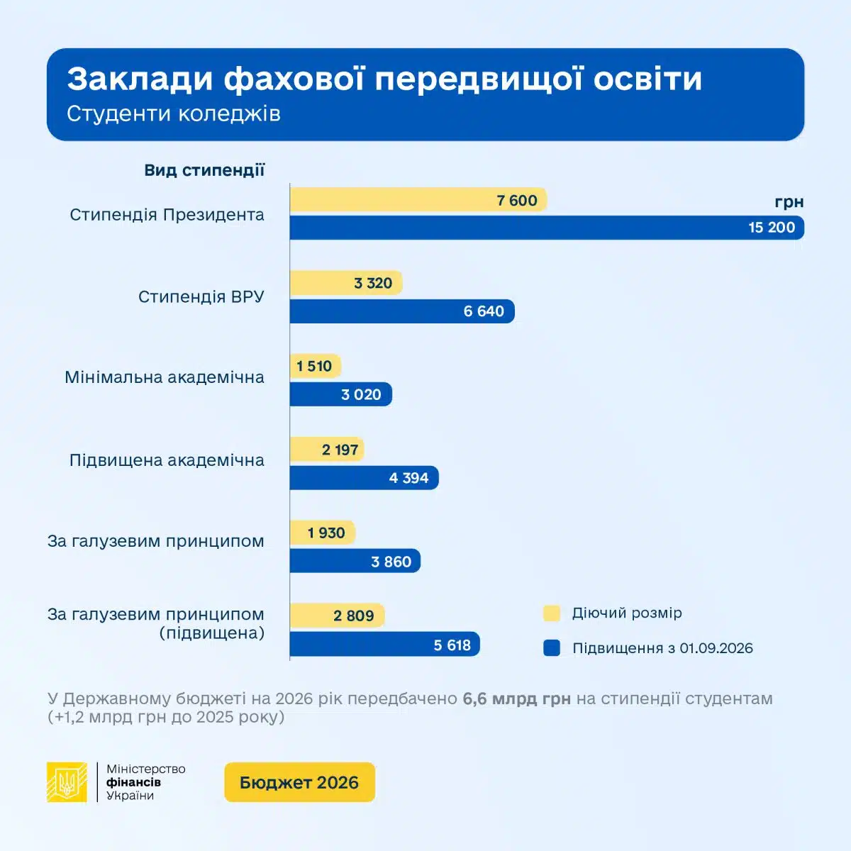 - Стипендія Верховної Ради – з 3 320 до 6 640 грн;