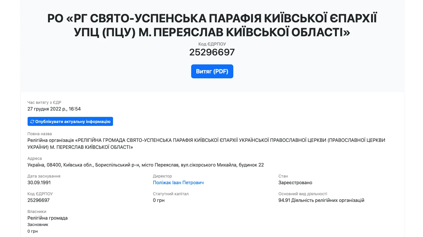 Proslav знайшов релігійну організацію у відкритому реєстрі Опендатабот і відповідно до результатів зборів релігійної громади, які підтримали перехід по ПЦУ, 12 грудня 2022 року релігійна організація змінила назву на «РЕЛІГІЙНА ГРОМАДА СВЯТО-УСПЕНСЬКА ПАРАФІЯ КИЇВСЬКОЇ ЄПАРХІЇ УКРАЇНСЬКОЇ ПРАВОСЛАВНОЇ ЦЕРКВИ (ПРАВОСЛАВНОЇ ЦЕРКВИ УКРАЇНИ) М. ПЕРЕЯСЛАВ КИЇВСЬКОЇ ОБЛАСТІ» та змінився керівник з Гайдучка Івана Мироновича на Поліжака Івана Петровича.