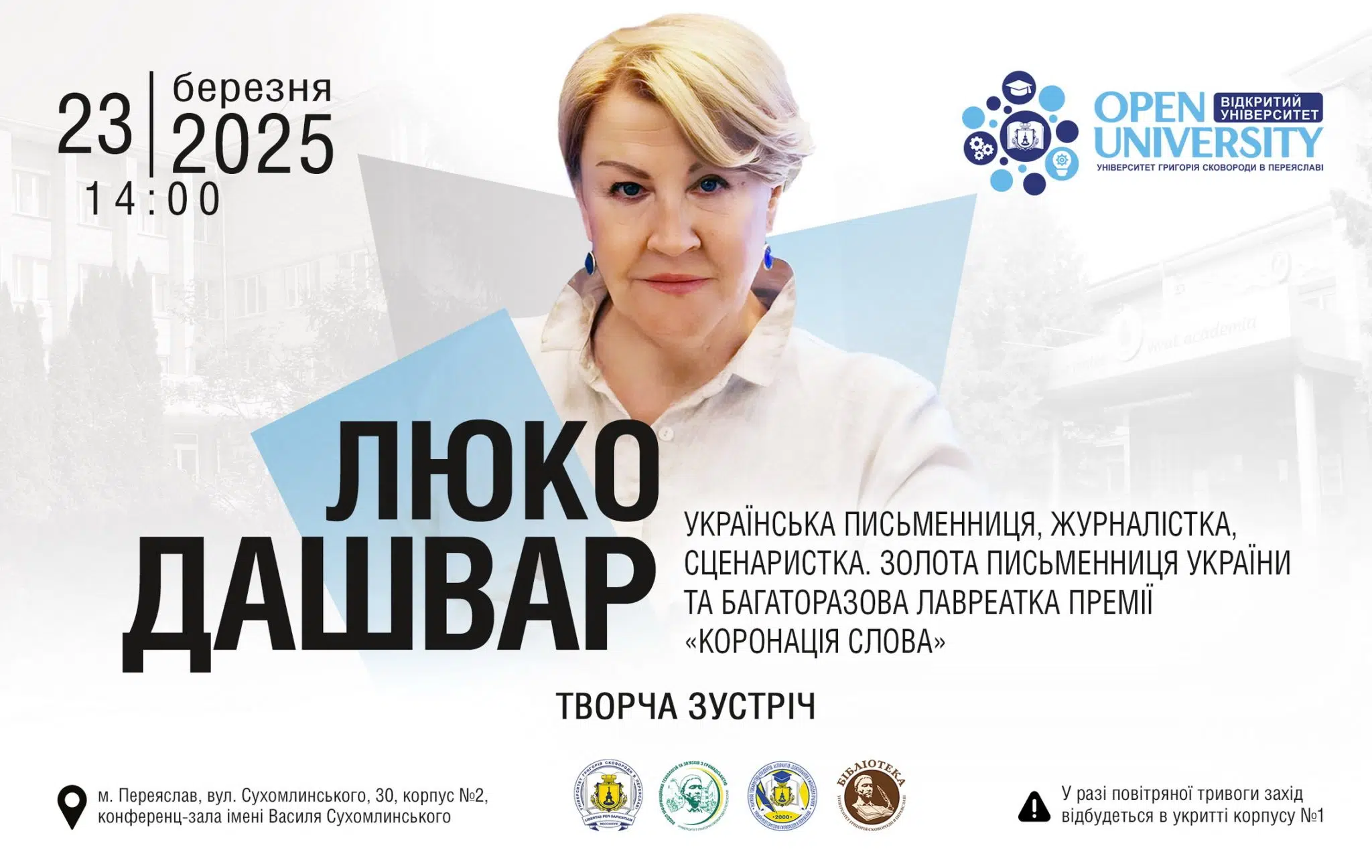 Вже завтра, 23 березня в Університет Григорія Сковороди в Переяславі, у рамках його проекту «Відкритий університет», завітає сучасна українська письменниця Люко Дашвар. Зустріч розпочнеться о 14:00 у конференц-залі імені Василя Сухомлинського, передає Proslav посилаючись на сайт університету.