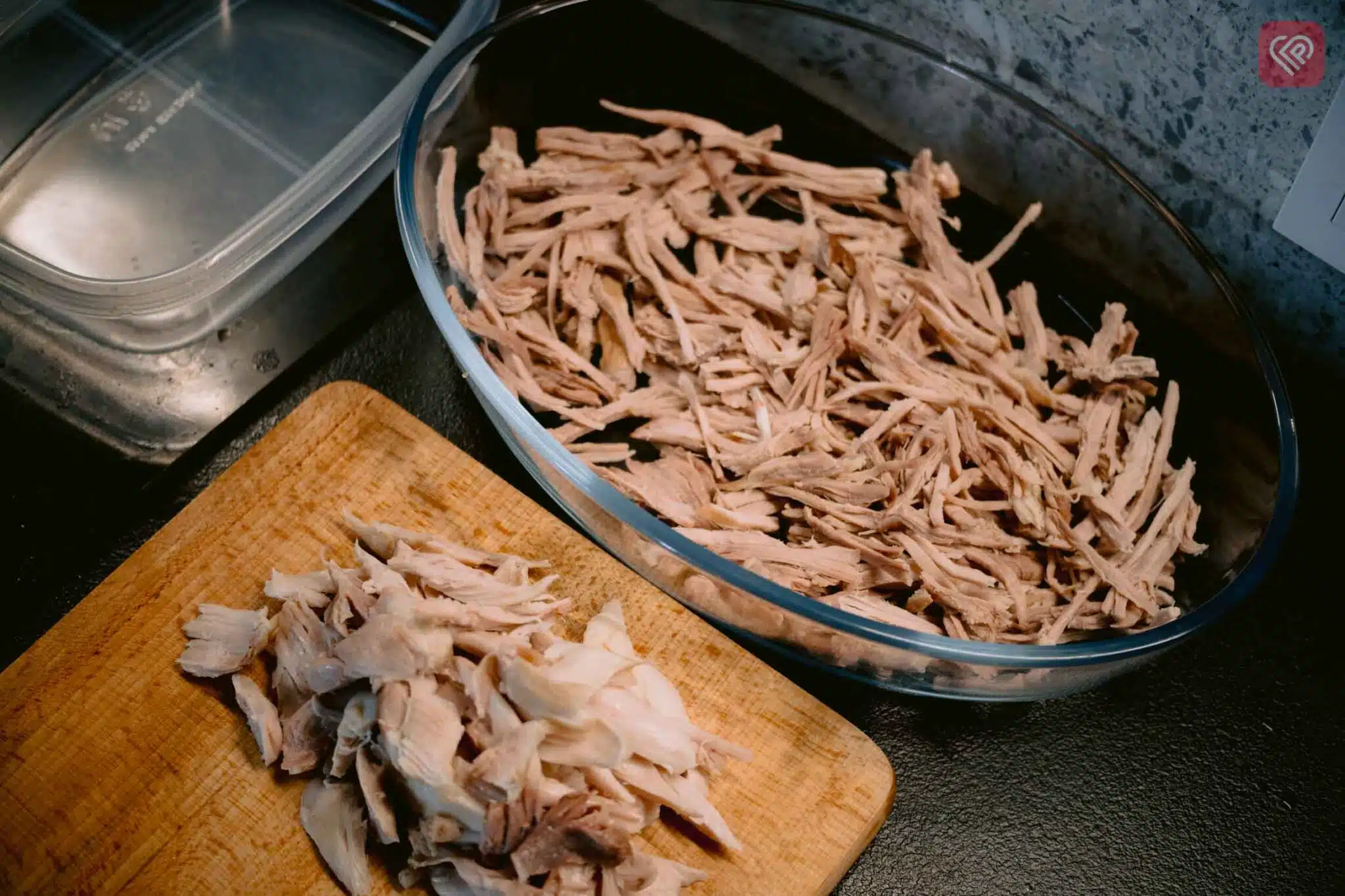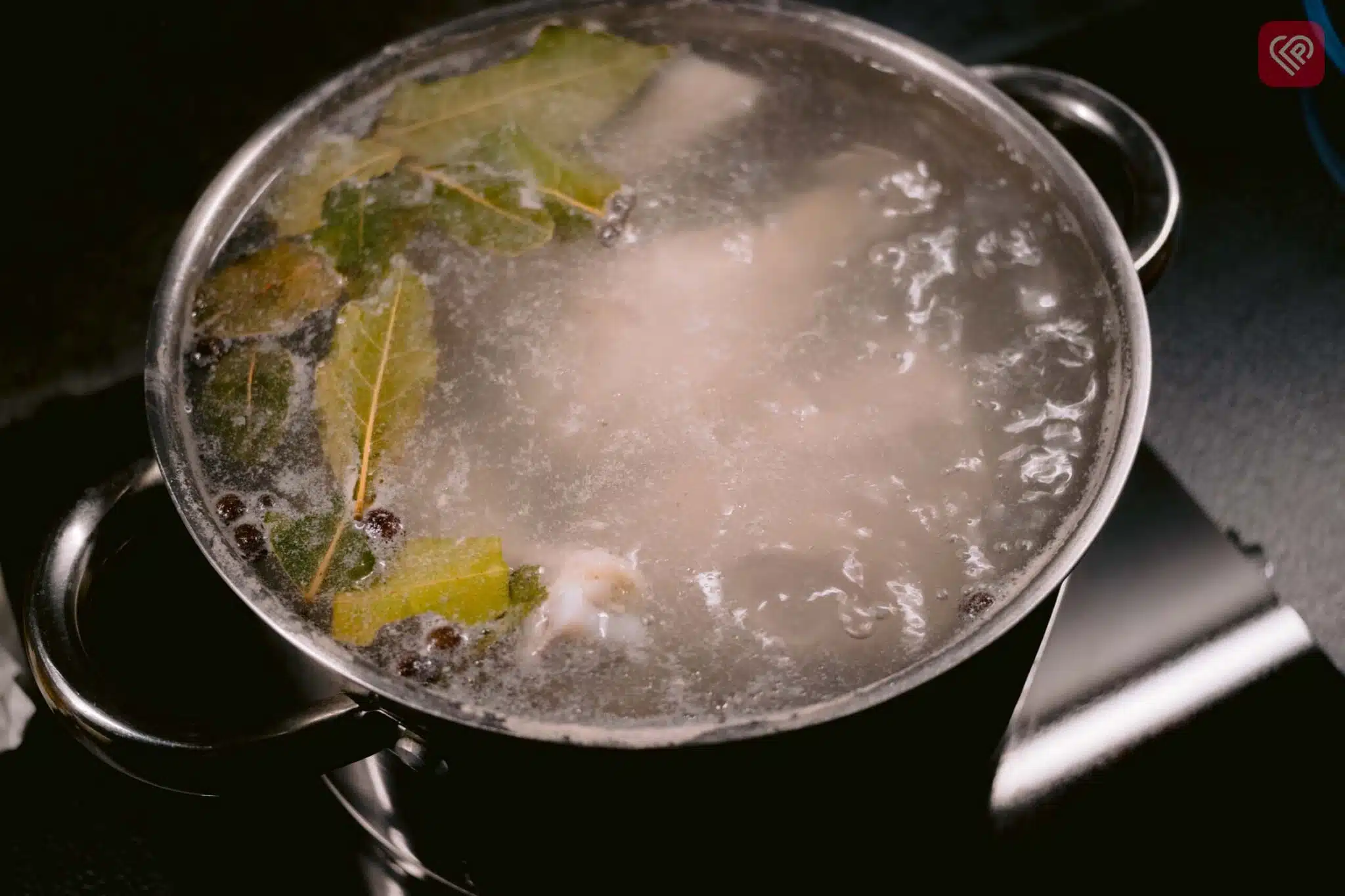 Чекаємо аби вода закипіла, знімаємо шум, додаємо лавровий лист та духмяний перець. Ставимо на маленький вогонь. Через годину дістаємо звідти курячі гомілки, а ще через пів години – свинину. Розділяємо мʼясо на волокна.