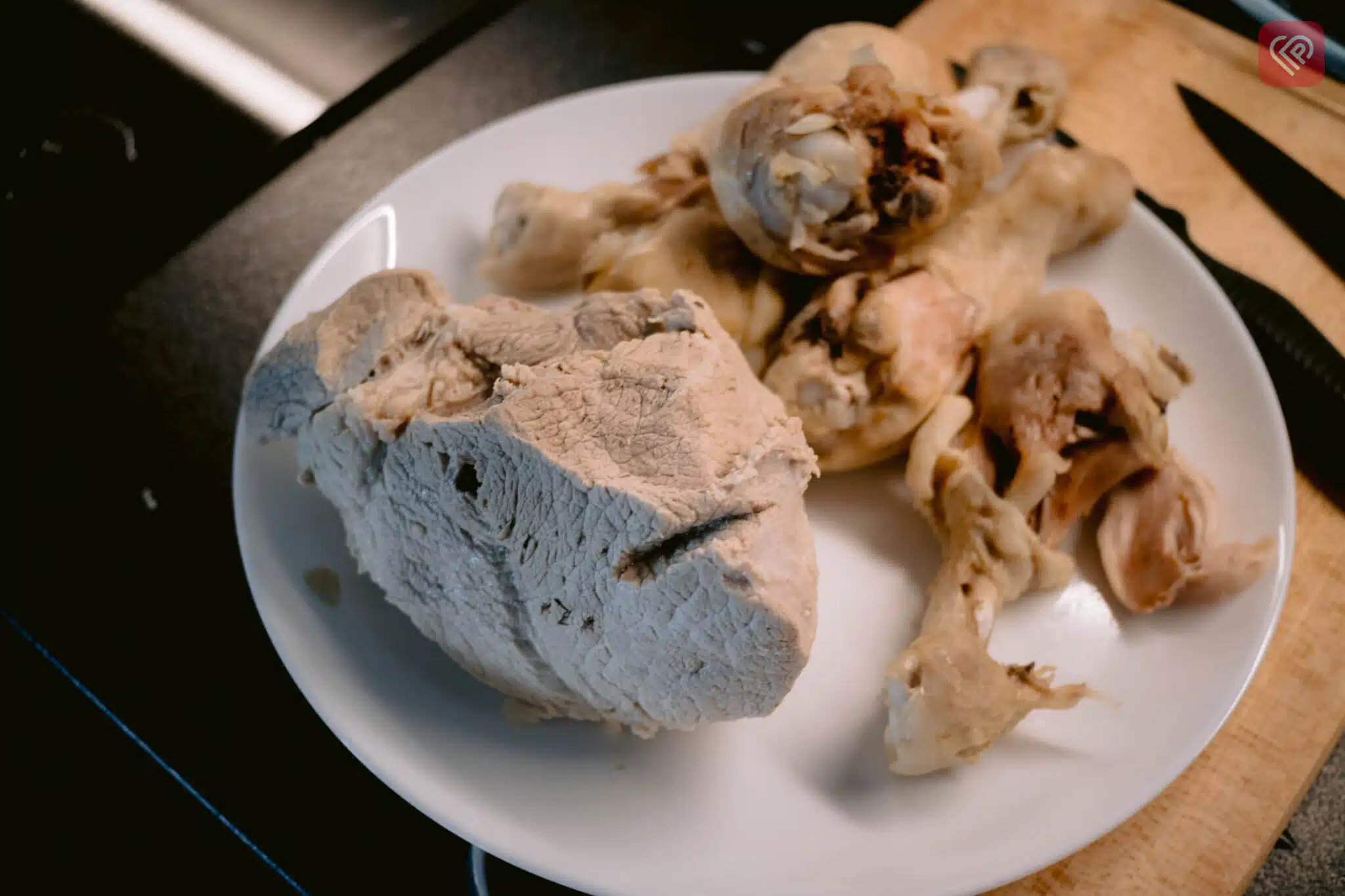 Я використовував все мʼясо в холодці, на одну сторону – курку, на іншу – свиню. Також поверх я додав копчену паприку, аби був кльовий колір. Мʼясо заливаємо бульйоном та залишаємо охолоджуватися за кімнатної температури. Потім переставляємо в холодильник (або на балкон) для стабілізації на ніч.