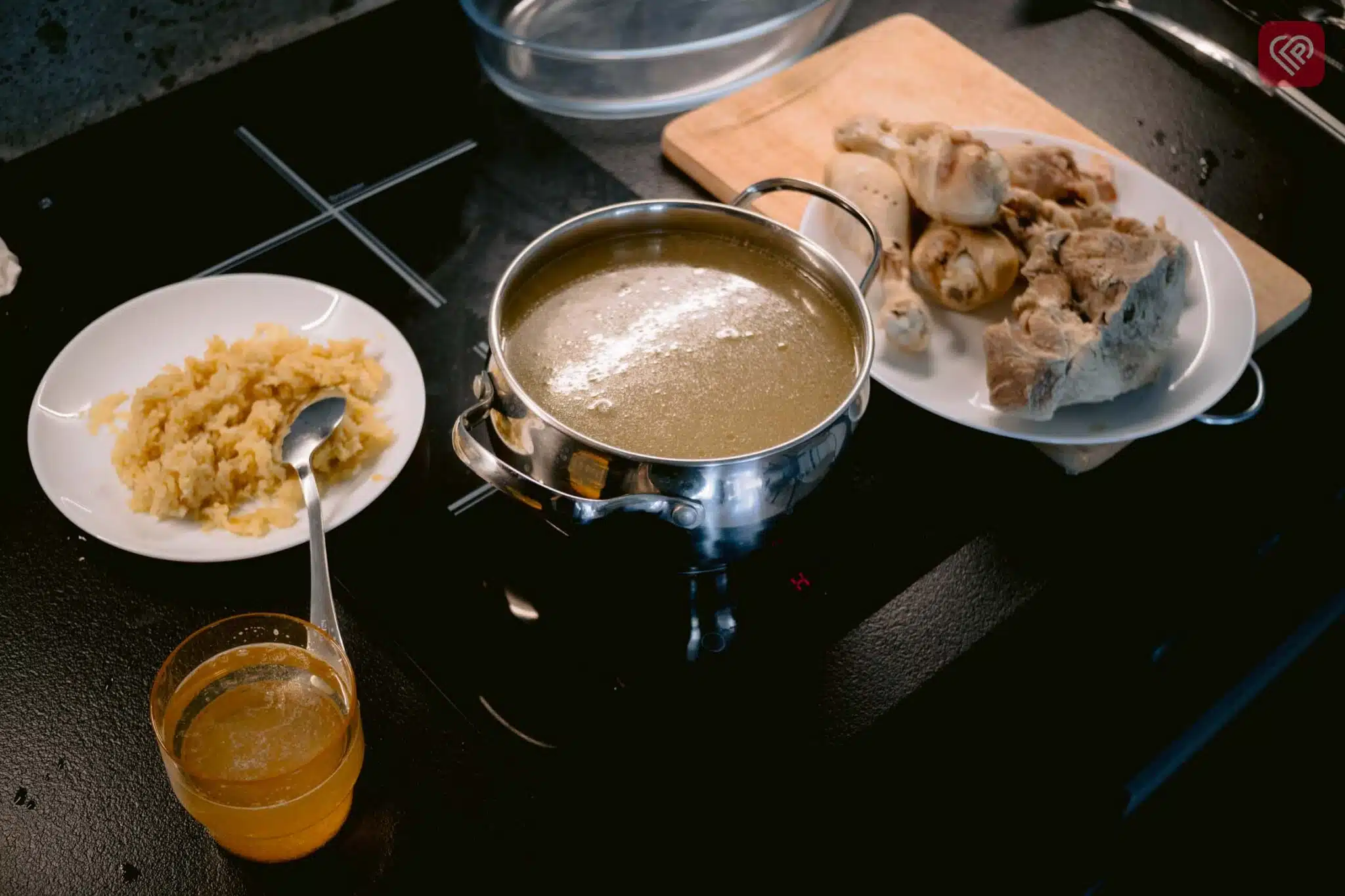 Запечений часник чистим від лушпиння та подрібнюємо його через дрібне сито, часникодавку чи дуже мілко працюємо ножем. Бульйон проціджуємо, аби він був прозорим. Поступово додаємо часникове пюре та сіль, постійно куштуємо аби кайфувати від смаку.