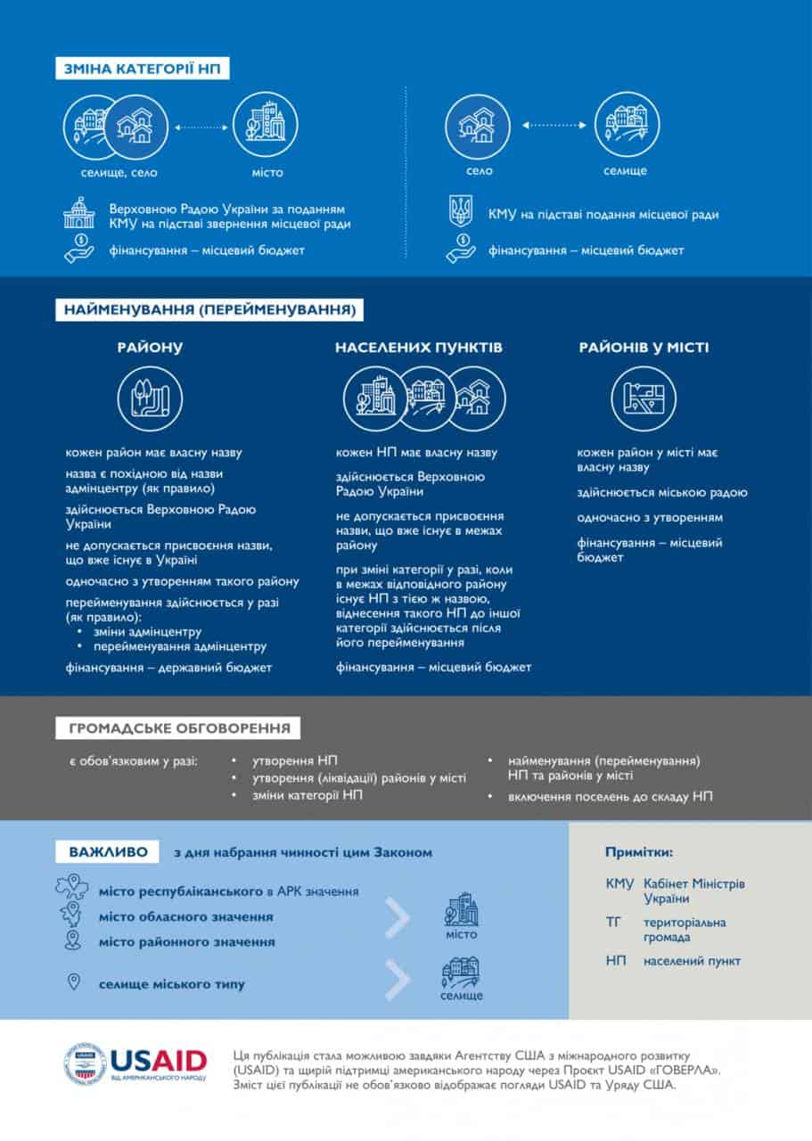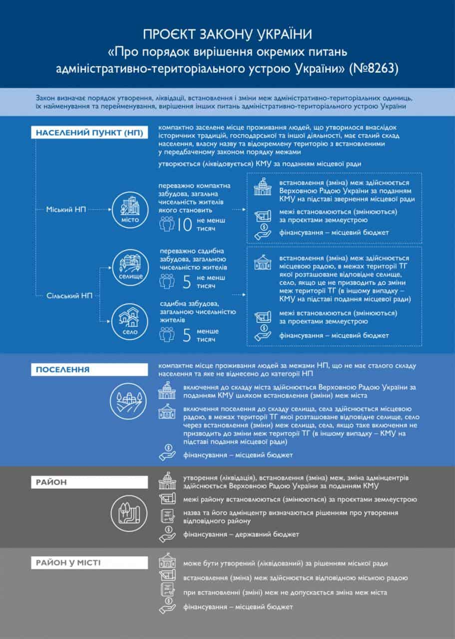 Серед іншого, ініціатива скасовує «поняття селище міського типу» (смт). Замість запроваджується нове поняття – «поселення».